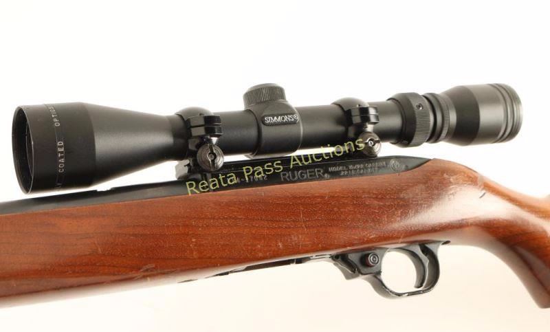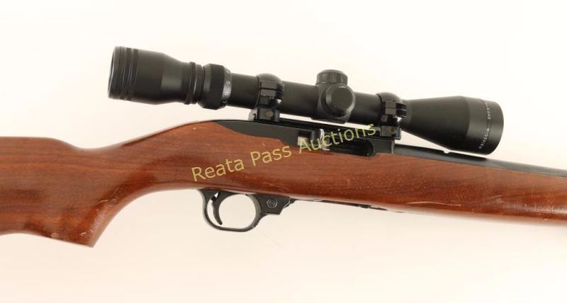 Magazine-fed semi-automatic rimfire rifle chambered in .22 Long Rifle, circa 1974. Features a blued/black finish, 18.5" tapered barrel, dovetailed blade front sight with brass bead, removed rear sight, Simmons 21830MR 3-9x scope, smooth trigger, push button safety, no magazine, bolt hold open lever, swivel studs and smooth one-piece walnut pistol grip shoulder stock with metal buttplate. Rifle exhibits approximately 90% of it's original finish showing muzzle wear, edge wear on the receiver, scattered handling marks/wear on the barrel and some examples of light emerging surface rust on the barrel near the receiver. Action is smooth, bore is very good+ and wood stock is good with several small blemishes. Condition is good+++. ***Modern Firearm***