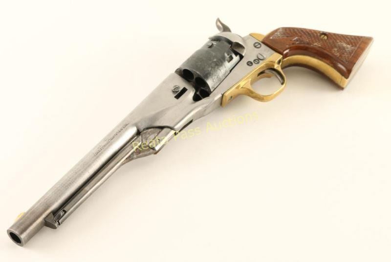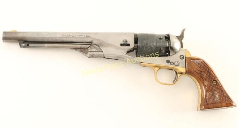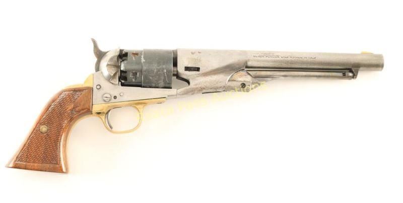 Italian made reproduction of a Colt 1860 Army single -action percussion revolver, chambered for .44 caliber ammunition. Features a 8" barrel(missing the barrel wedge), brass blade front sight, notched rear sight, blued six-shot cylinder with roll-stamped naval engagement scene, case hardened hammer with checkered spur, brass triggerguard & backstrap, loading lever, and custom two-piece checkered wood grip. The barrel & frame have been heavily cleaned and are now in-the-white. The cylinder exhibits approximately 87% of it's blued finish showing wear on the front face, a thin drag line and some rust in a couple of the cylinder stops. Action is sound, bore is excellent and grip are very good+.. Condition is good as parts. ***Antique Firearms***