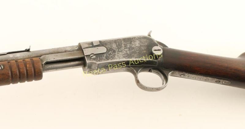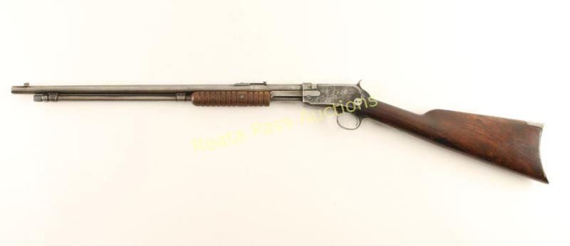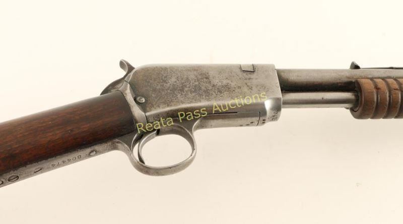 Vintage take-down slide action repeating rifle chambered in .22 Short, Long & Long Rifle, circa 1936-1938. Features a blued finish, 20" barrel, blade front sight, adjustable rear sporting sight, full-length tube magazine, smooth trigger, checkered hammer spur, grooved walnut slide handle and straight grip shoulder stock with crescent metal buttplate. Rifle exhibits approximately 10% of it's blued finish with the balance of the metal surfaces in-the-white showing a light brown patina forming. The barrel has four plugged holes on the left side near the the rear sight. Action is mechanically sound, bore is excellent and wood stocks are good with numerous dings on the slide handle & small cracks extending from the buttplate on the shoulder stock. Condition is good. ***C&R Firearm*** ***Modern Firearm***