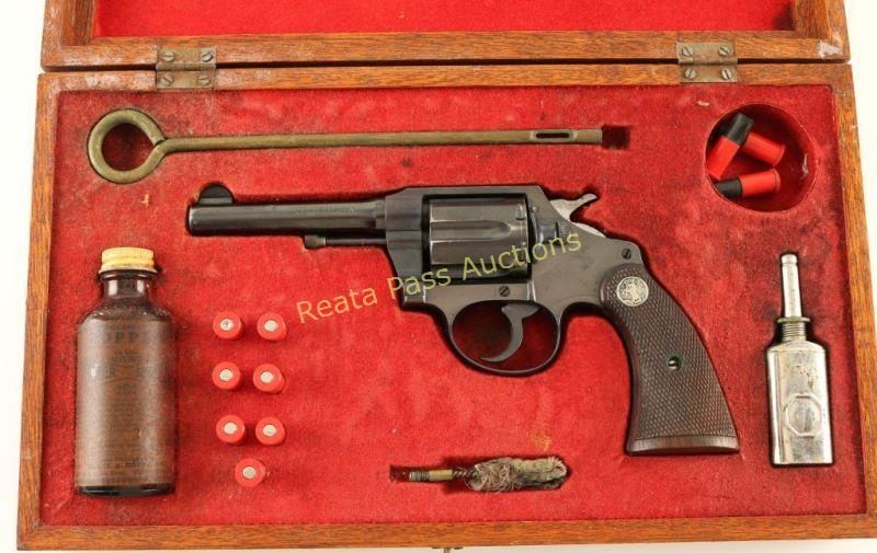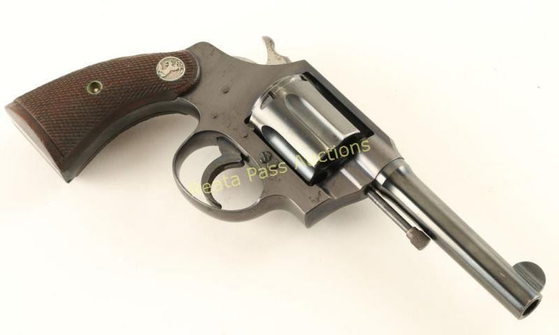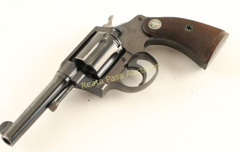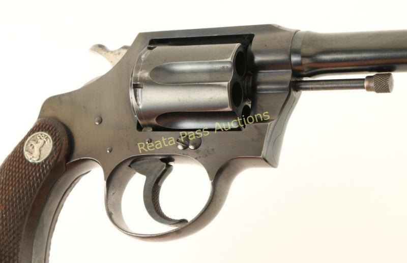 Cased double action six-shot revolver chambered in .38 Special, circa 1930. Features a blued finish, 4" tapered barrel, non-shrouded ejector rod, blade front sight, square-notched rear sight, long fluted cylinder, checkered trigger & hammer spur and Colt medallion two-piece checkered walnut grips. Includes a wood display case with fitted interior that includes a brass cleaning rod, solvent, oiler, bore brush, gun rag and 10 Speer plastic rounds. Revolver exhibits approximately 88% of its original blued finish showing holster wear, thinning on the backstrap and some light scattered examples of emerging surface rust found on the frame, cylinder & backstrap. Action is crisp with solid lock-up, bore is pristine and wood grips are near fine. Condition is very good+++ in case. ***C&R Firearm*** ***Modern Firearm***