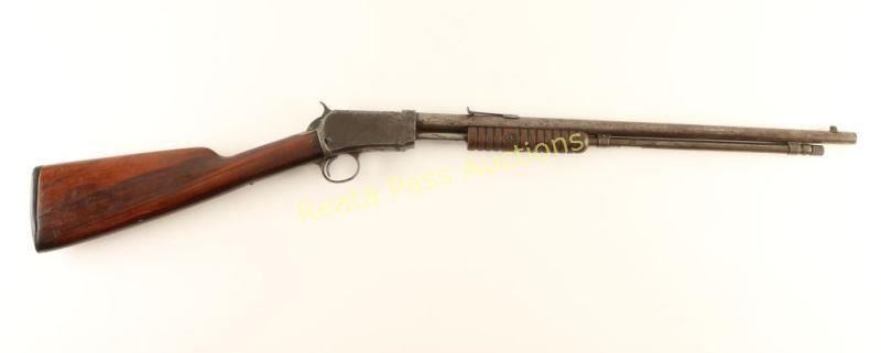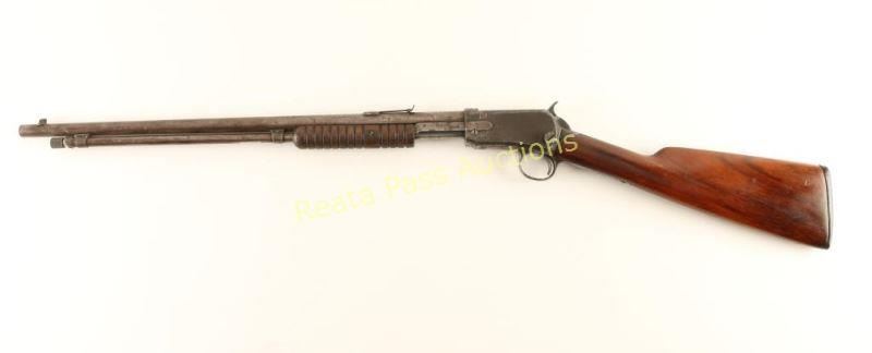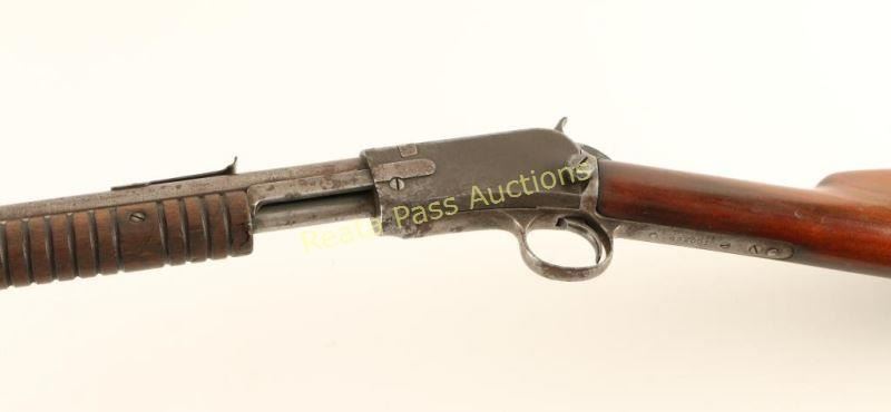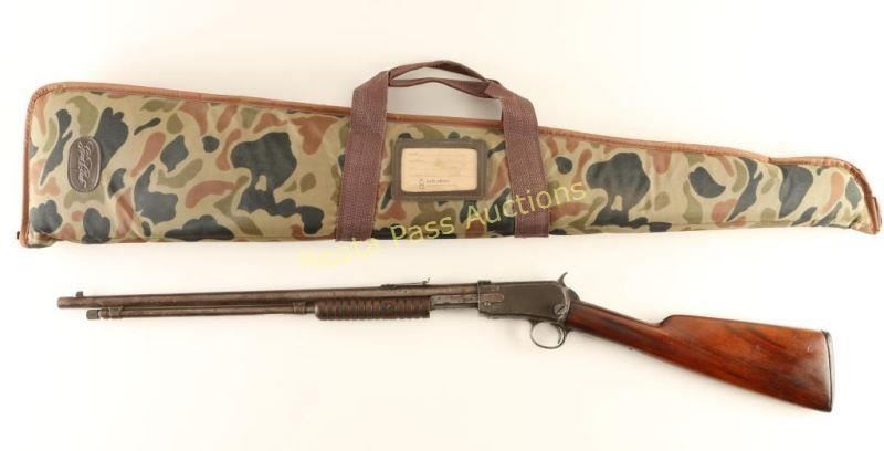 Vintage take-down slide action repeating rifle chambered in .22 Short, Long or Long Rifle, circa 1915. Features a blued finish, 20" barrel, dovetailed blade front sight, adjustable rear sporting sight, full-length magazine tube, take-down receiver, smooth trigger, checkered hammer spur, grooved wood slide handle and straight grip shoulder stock with custom black hard rubber buttplate & 12 3/4" LOP. Includes a Bob Allen Gun Club padded soft case with camouflage exterior and an Official NRA .22 caliber Exe-Scorer. Rifle exhibits little remaining finish with majority of the metal surfaces in-the-white displaying a brown patina with light scattered surface rust. Action performs well, bore is good showing some light pitting and wood stocks are good. Condition is near good. ***C&R Firearm*** ***Modern Firearm***