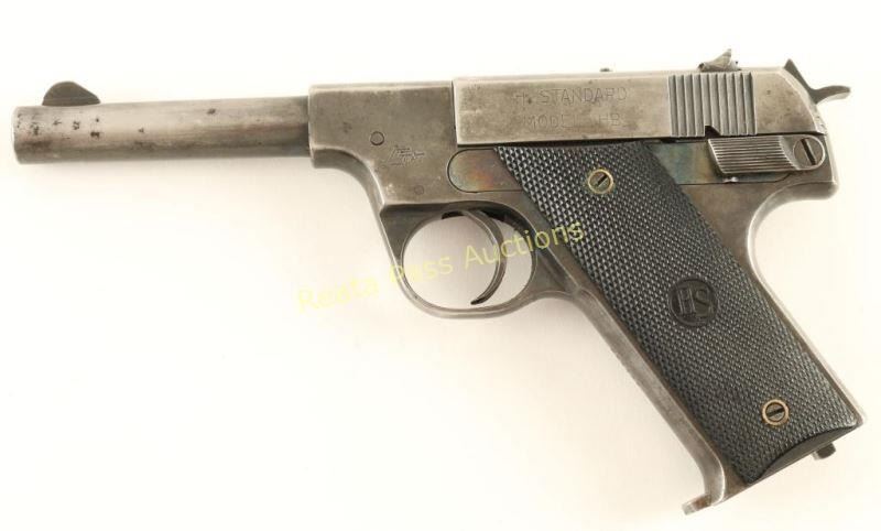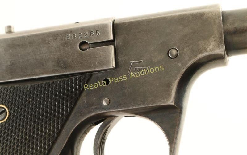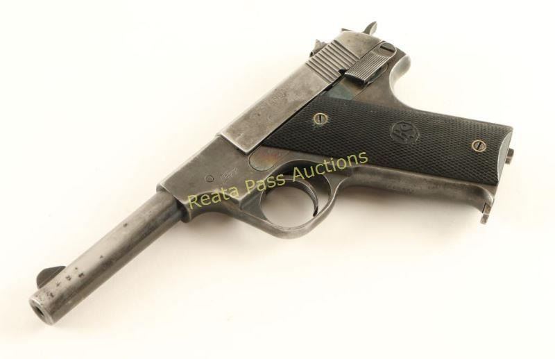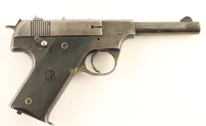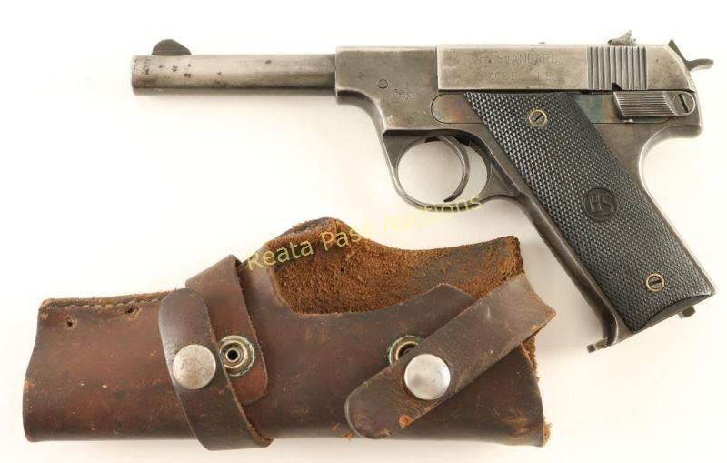 ‘Second Model’ Refinished semi-automatic rimfire pistol chambered in .22 Long Rifle, circa 1948-1949. Features a blued refinish, 4.5” barrel, patridge front sight, dovetailed rear window sight, steel frame, serrated trigger, checkered hammer spur, thumb safety, 10 round magazine and two-piece checkered black hard rubber grips with ‘HS’ monogram. Includes a modified smooth brown leather belt loop holster. Pistol exhibits approximately 30% of it’s blued refinish showing heavy wear and some cleaning on the barrel around a few scattered spots of dark rust. The frame is crudely monogrammed on each side ‘GM’ and the address/patent markings on the left side have been buffed out. Action needs work as the recoil springs seems to grind when worked, bore appears very good but dirty and the hard rubber grips are very good. Condition is near good. ***C&R Firearm*** ***Modern Firearm***