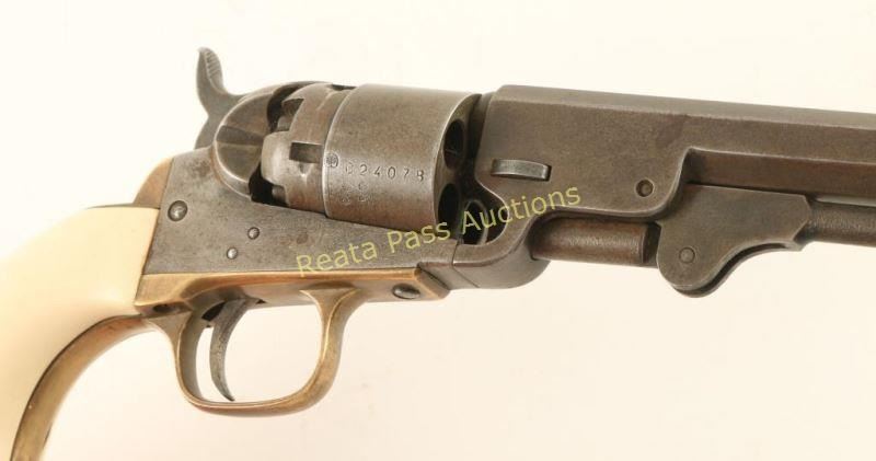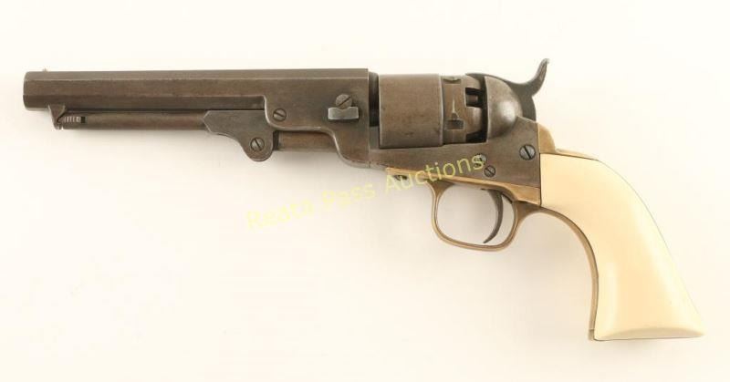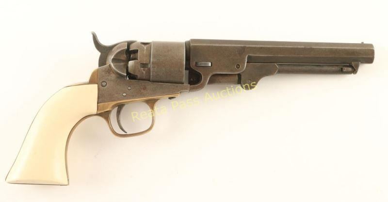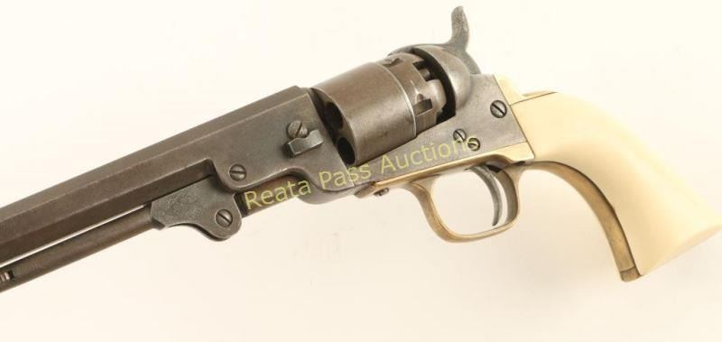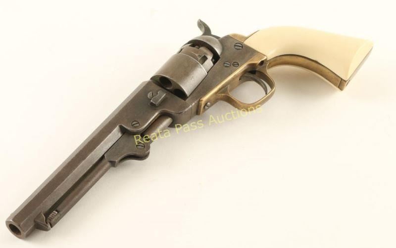 Italian reproduction of the Colt 1862 Pocket Navy model chambered for .36 caliber ammunition. Features a distressed blued finish. 5.5" octagonal barrel, loading lever, brass bead front sight, notched rear sight on the hammer, non-fluted five shot cylinder w/o scene, brass triggerguard & backstrap and one-piece faux ivory grips. The maker marks appear to have been removed as the only visible markings are on the cylinder, they include a circled palm tree, "C24078" and Italian proofs. Revolver exhibits a lovely aged patina with a small area of dark surface rust on the right side of the frame behind the recoil shield. Action is sound, bore is good with what looks to be a thin layer of rust and faux ivory grips are very good. A neat little gun that is very reminiscent of the real deal. Condition is good to very good. ***Antique Firearm***