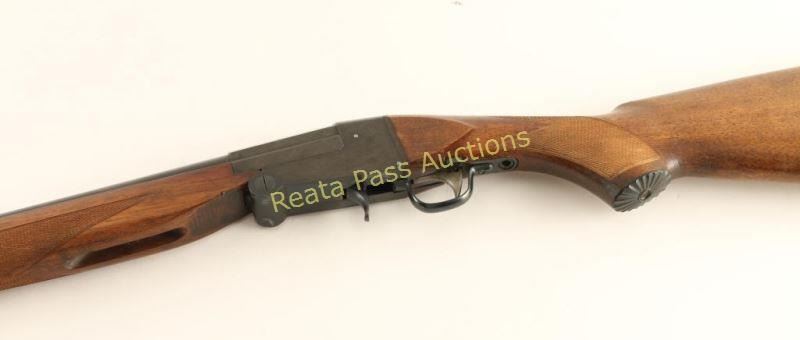 Italian made single-shot folding shotgun chambered for 2 3/4" 12 gauge shells, circa 1962. Featured a blued finish, 21" barrel, extractor, large bead front sight, smooth trigger, manual safety, checkered walnut forend and pistol grip shoulder stock with black grip cap & hard rubber buttplate. Shotgun exhibits approximately 90% of it's original finish showing minor wear and some light scattered spots of emerging surface rust. Action is sound, bore is pristine and wood stocks are very good. Condition is good to very good. ***C&R Firearm*** ***Modern Firearm***