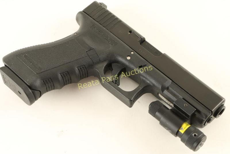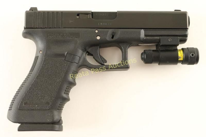 Austrian made full-size safe action semi-automatic pistol chambered in .40 Smith & Wesson. Features a black coated finish, 4.49" barrel, white dot patridge front sight, white outlined rear window sight, laser light, trigger safety, push button magazine release, 15 round factory magazine with a Pearce grip floorplate, and durable black polymer frame with integral accessory rail & finger groove grip. Pistol exhibits approximately 99% of it's black coated finish with very little wear observed. Action is crisp, bore is pristine and polymer is fine. Condition is near new. ***Modern Firearm***