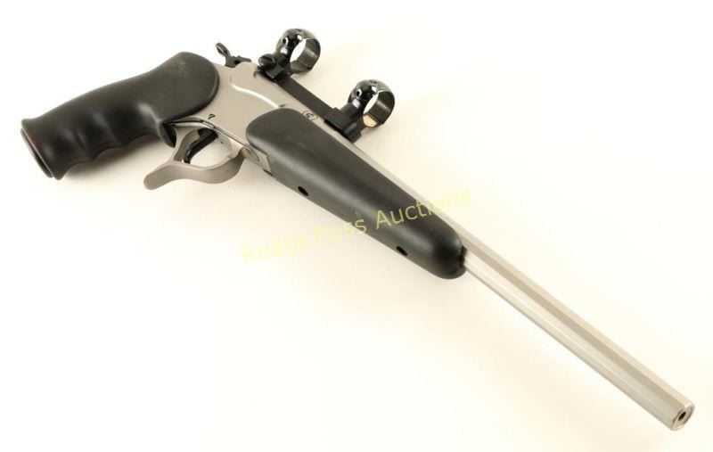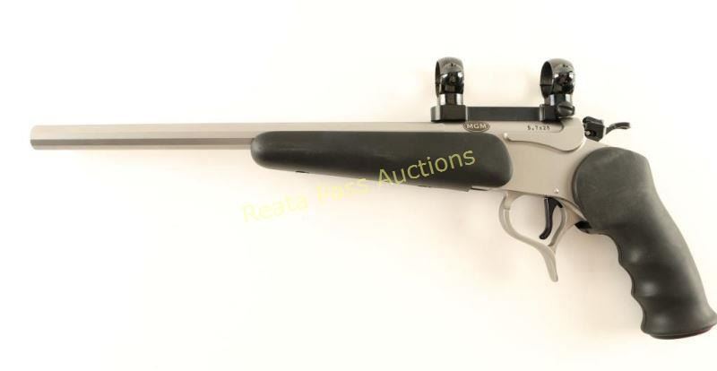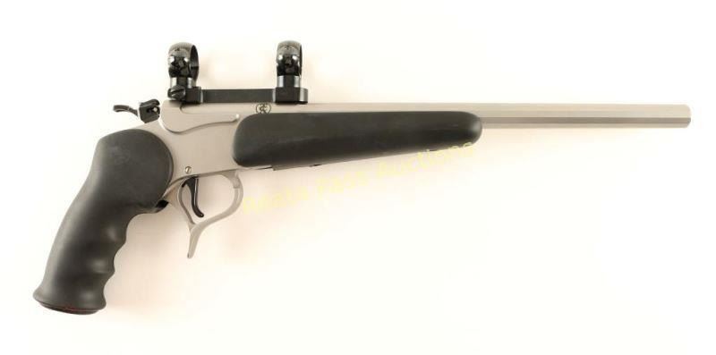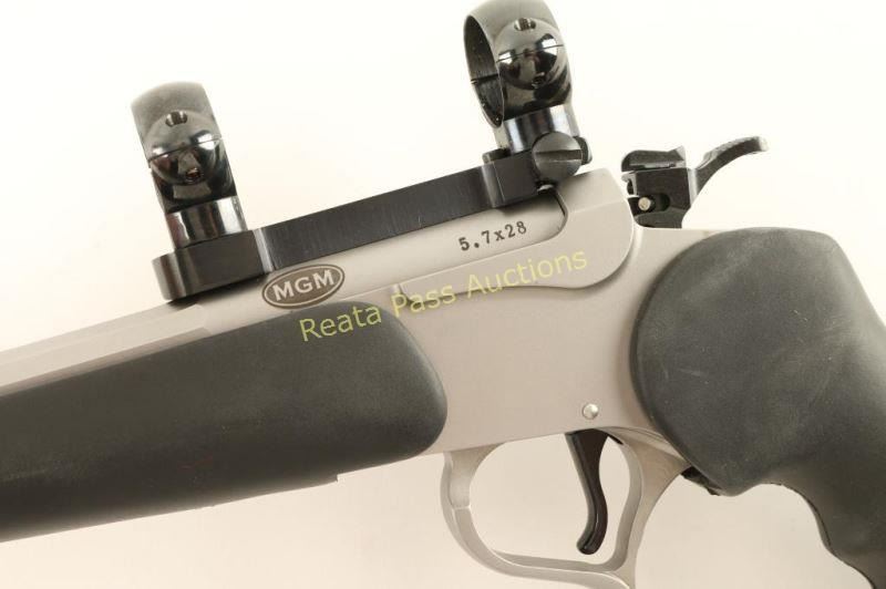 SN: SG3233 Modular stainless steel break-action single shot pistol chambered in 5.7x28mm. Features a matte finish, 14" MGM dodecagonal barrel with no provisions for sights, Burris scope base & rings, smooth trigger, three-position firing pin selector switch on the hammer and TC smooth black rubber stocks. Pistol exhibits little to no visible wear. Action is crisp, bore is excellent and rubber stocks are fine. Condition is excellent. ***Modern Firearm***