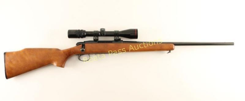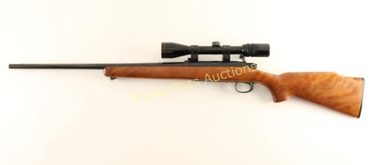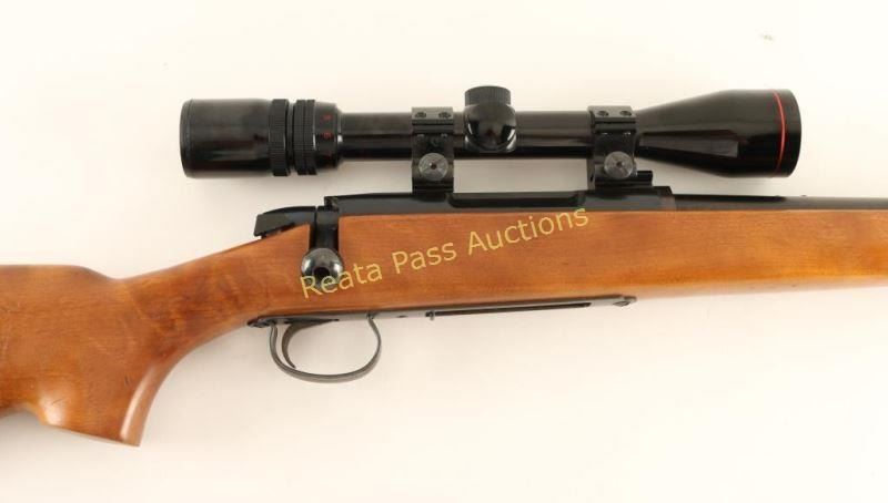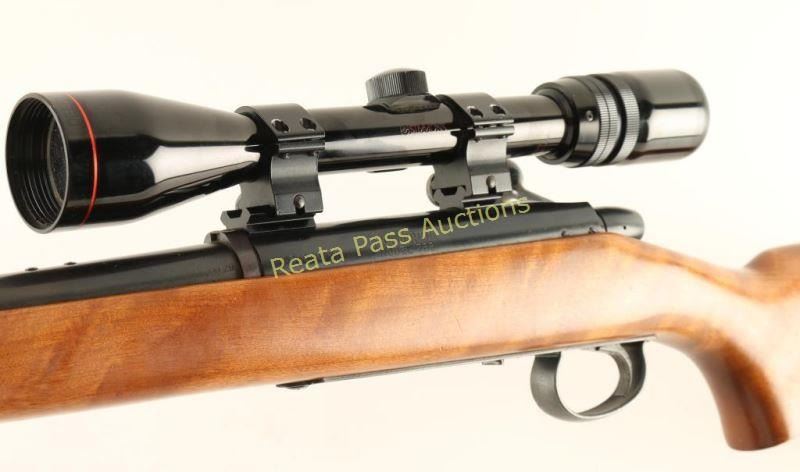 Magazine fed bolt action sporting rifle chambered in 6mm Remington, circa 1967-1983. Features a blued finish, 22" barrel with provisions for sights, Simmons 21028 3-9x scope, drilled & tapped receiver for a side mounted sight, no magazine, manual safety, beveled trigger, sling swivel and one-piece smooth wood pistol grip shoulder stock with high comb & factory hard rubber buttplate. Rifle exhibits approximately 93% of it's of it's original finish showing little wear and some light scattered oxidation/rust. Action is smooth, bore is excellent and wood stock is very good. Condition is very good+. ***Modern Firearm***
