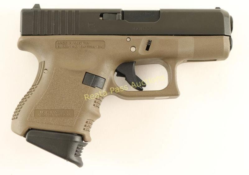 Austrian made sub-compact safe action semi-automatic pistol chambered in .40 Smith & Wesson. Features a black coated finish, 3.42" barrel, white dot patridge front sight, white outlined rear window sight, trigger safety, push button magazine release, 9 round factory magazine with Pearce Grip +1 pinky extension floorplate, and durable FDE polymer frame with integral finger groove grip. Includes a factory hard case with documents, cleaning rod and brush. Pistol exhibits approximately 99% of it's black coated finish with only slight wear on the barrel observed. Action is crisp, bore is pristine and polymer is fine. Condition is near new in box. ***Modern Firearm***