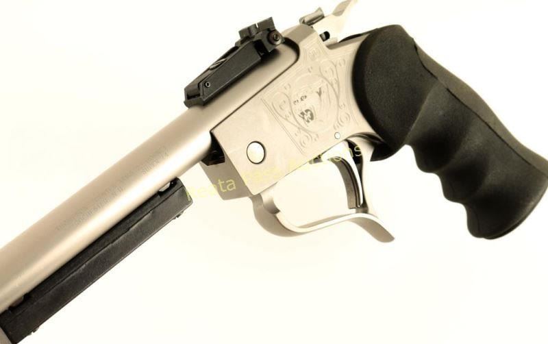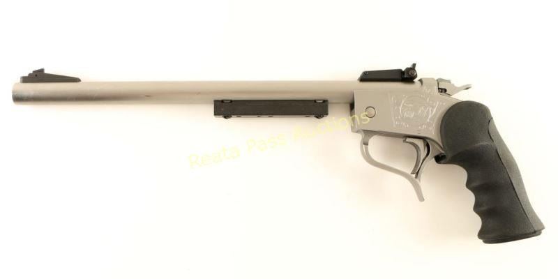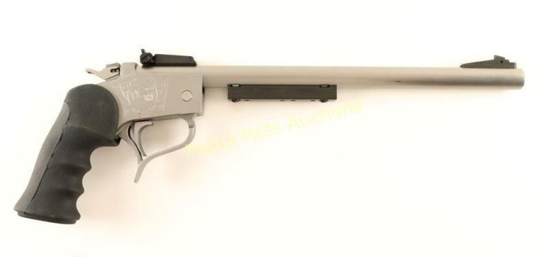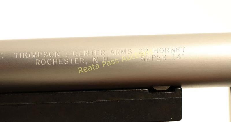 SN: S41969 Modular stainless steel break-action single shot pistol chambered in .22 Hornet, circa 1999. Features a brushed/matte finish, Super 14" barrel, ramped blade front sight, adjustable rear window sight, cougar head engraved receiver, three-position firing pin selector switch on the hammer, no forend and TC one-piece black composite finger groove grip. Pistol exhibits light scratches & scuffs on the barrel and some minor rubs on the frame from a previous forend. Action is crisp, bore is very good and composite grip is fine. Condition is very good. ***Modern Firearm***