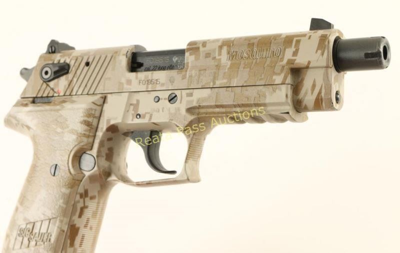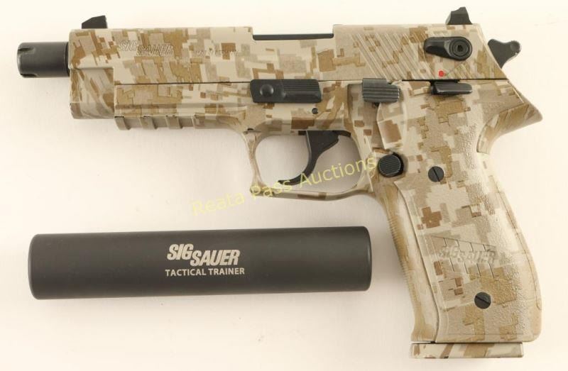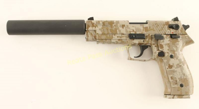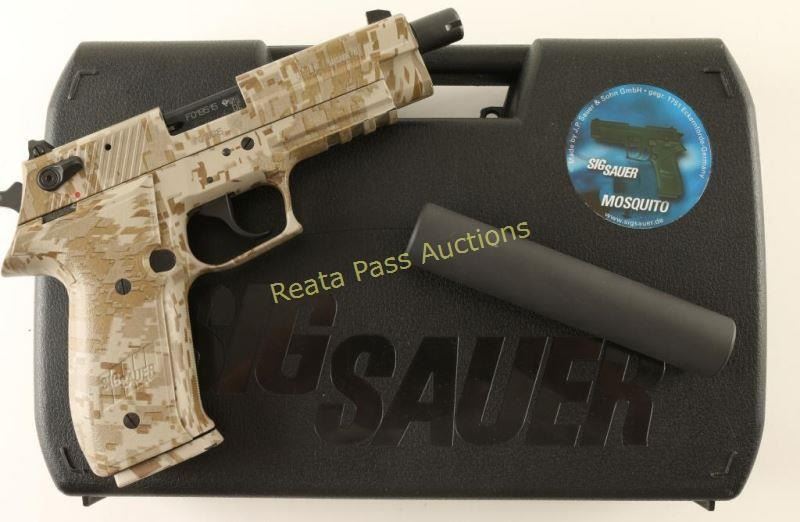 German made double-action semi-automatic pistol chambered in .22 Long Rifle. Features a Desert Digital Camo finish, 4.75" threaded barrel with tread protector, high contract three-dot sight with drift adjustable rear, thumb decker, manual safety, smooth trigger, serrated round hammer spur, push button magazine release, 10round factory magazine, polymer frame with integral accessory rail and Sig Sauer two-piece textured plastic grips. Includes the original factory hard case with documents and Tactical Trainer faux suppressor. Pistol retains approximately 96% of it's Desert Digital Camo finish showing a few spots with high point edge wear. Action is smooth, bore is excellent and plastic grips are fine. Condition is near excellent in case. ***Modern Firearm***