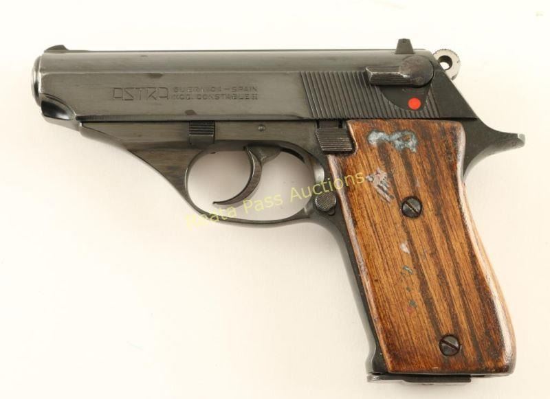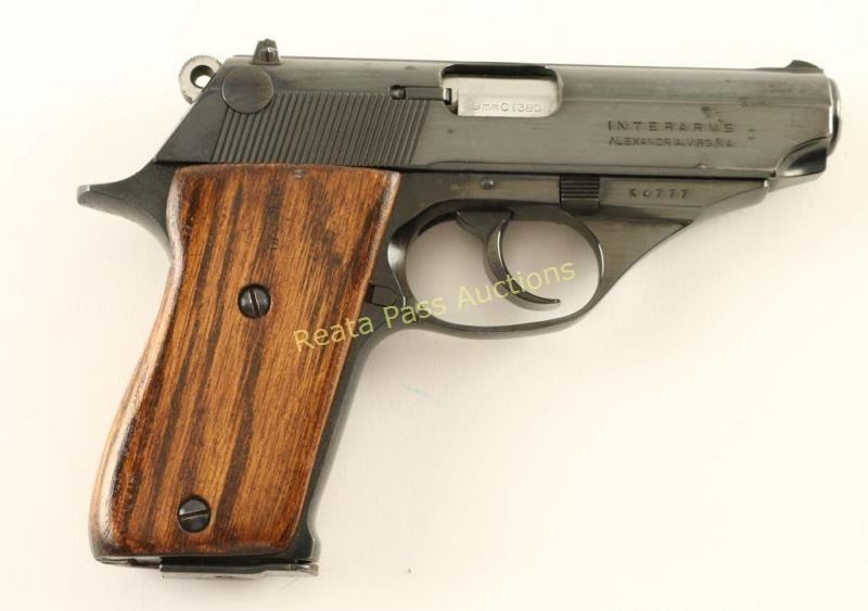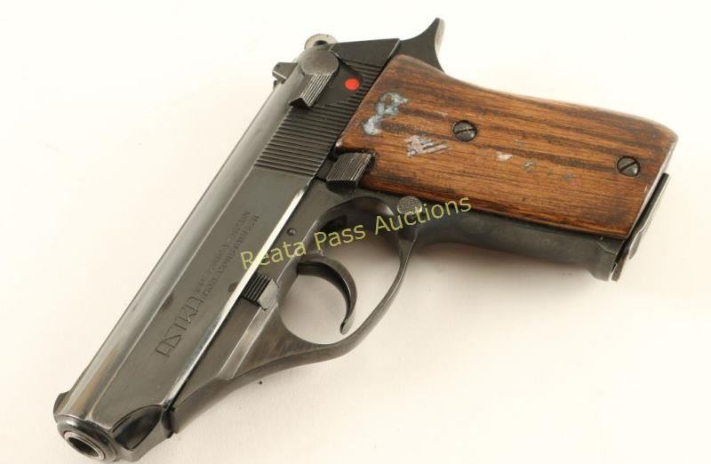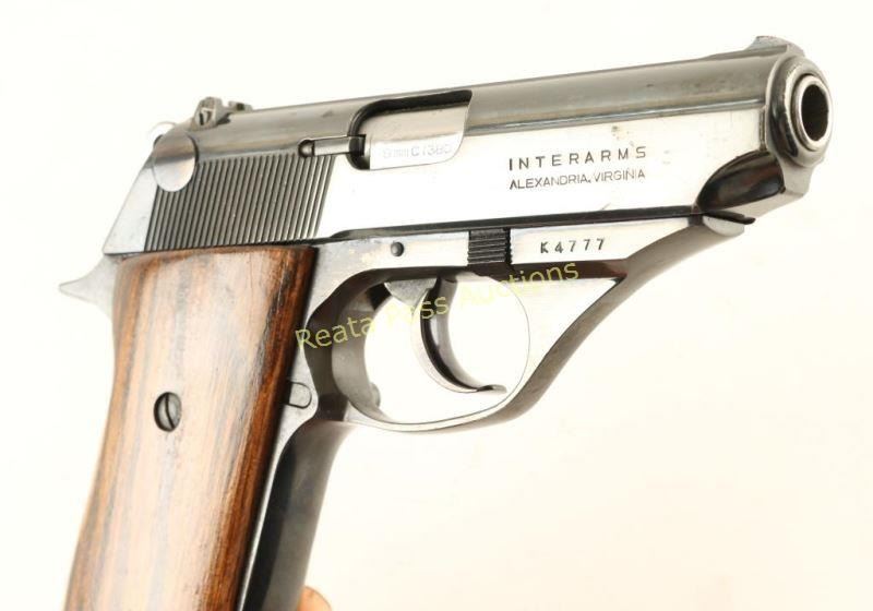 Spanish made copy of the Walther PPK chambered in 9mm Corto. Imported by Interarms of Alexandria, Virginia with import marks on the slide. Features a blued finish, 3.5" barrel, patridge front sight, adjustable rear window sight, steel frame, smooth trigger, serrated round hammer spur, slide stop, thumb safety, push button magazine release, 7 round magazine and two-piece smooth wood grips. Pistol exhibits approximately 85% of it's blued finish showing some edge wear and light scattered surface rust. Action is strong, bore is very good+ and wood grips are good with some paper like material adhered to the left panel. Condition is good+. ***Modern Firearm***