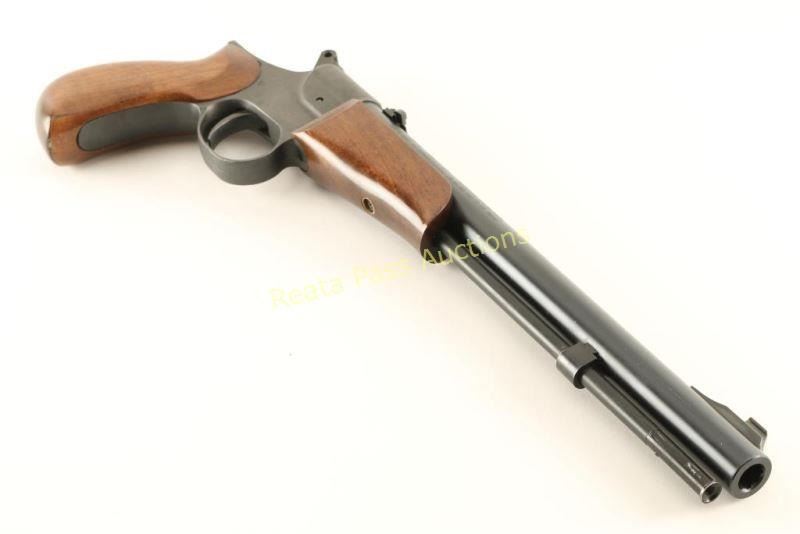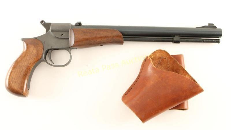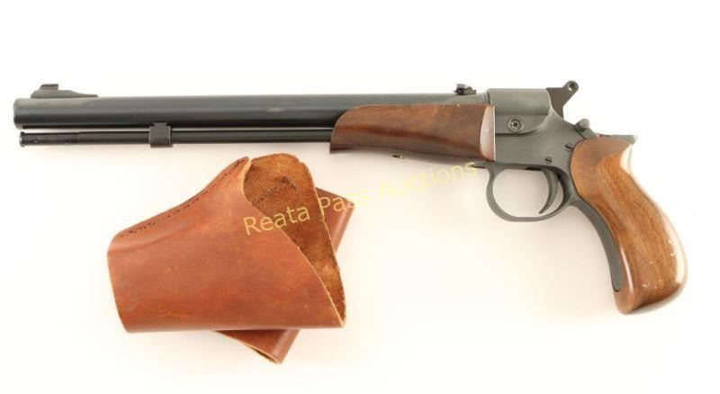 Spanish made single-shot in-line percussion pistol with .50 caliber bore. Features a blued finish, drilled & tapped 12 1/2" barrel, ramped blade front sight, adjustable flip-up rear sight, matte finished frame, large smooth trigger, serrated round hammer spur, manual safety, synthetic ram rod, smooth wood forend and one-piece wrap-around pistol grip. Includes a smooth brown leather belt loop holster by The Leatherman. Pistol exhibits approximately 95% of it's original finish showing light scattered handling marks. Action is crisp, bore is excellent and wood stocks are very good showing some dings & scrapes. Condition is very good++. ***Antique Firearm***