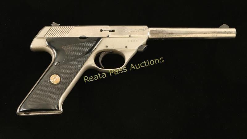 Nickeled, semi-automatic, single action pistol with a 6-3/4" barrel, blued; trigger, hold-open, safety and takedown and mag release, plastic grip panels. Plating is wearing through on edges and high points. Plating on frame is matte finish. Bore is shiny with good rifling. Action works well. Grips are with 3 small chips out of the bottoms. *Modern Firearm*