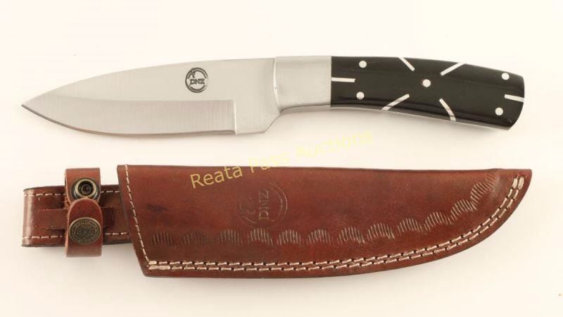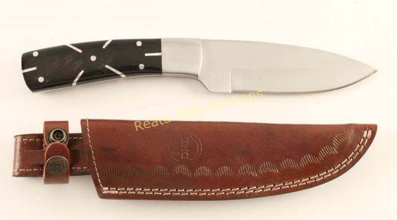 skinner with a custom phillppine black horn inlay handle. The drop point blade is approx 5.5", and the handle is approx 5" with a steel bolster. The blade is custom forged super hard 440c stainless ball bearing steel. A high quality leather sheath included.