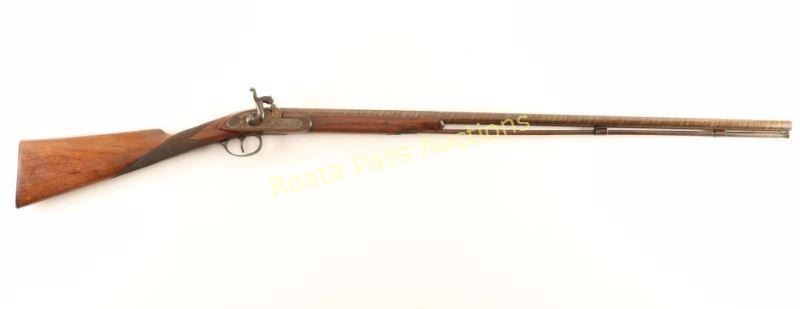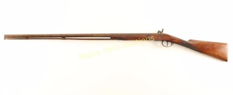 Belgian made, damascus steel, half octagon-half round barreled shotgun with a 33" barrel, missing front bead, ramrod with brass end and a worm on the other end, steel thimbles, color case hardened lock plate and hammer. Bluing is worn/faded with scratches and surface rust. Bore is dark and rusty. Lockwork is functional. Wood is dark with a repaired crack on the forend and scratches, rubs and dings. Damascus spiral pattern is very prominent. Condition is poor. *Antique Firearm*