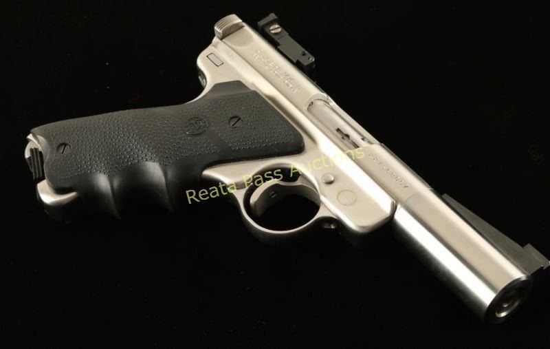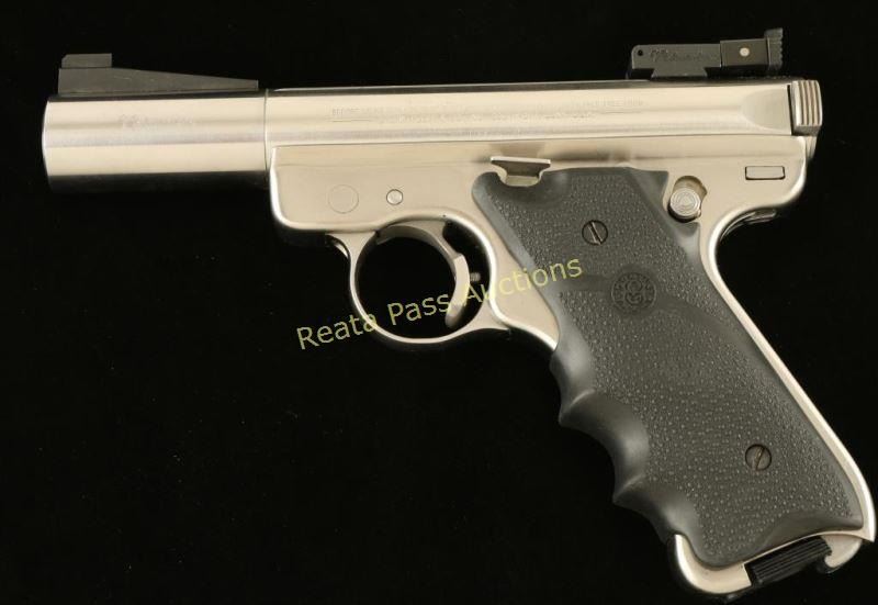 Customized stainless steel single-action semi-automatic target pistol chambered in .22 Long Rifle, circa 1997. Features a brushed finish, heavy 3.5" Volquartsen barrel, ramped patridge front sight, adjustable Volquartsen rear target sight, smooth target trigger, enlarged slide stop lever, manual safety, integral scope rails on the upper receiver, factory 10 round magazine, alloy frame and Hogue two-piece pebbled black rubber grips. Pistol exhibits only light muzzle wear and minor handling marks. Action is smooth, bore is excellent and rubber grips are fine. Condition is very good++. ***Modern Firearm***