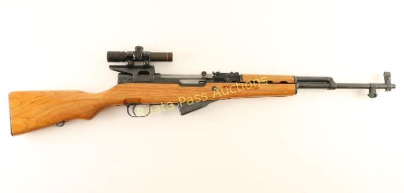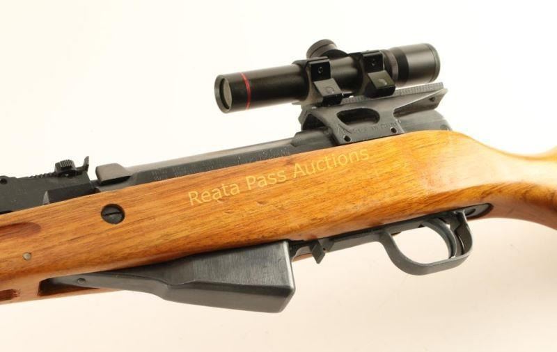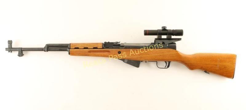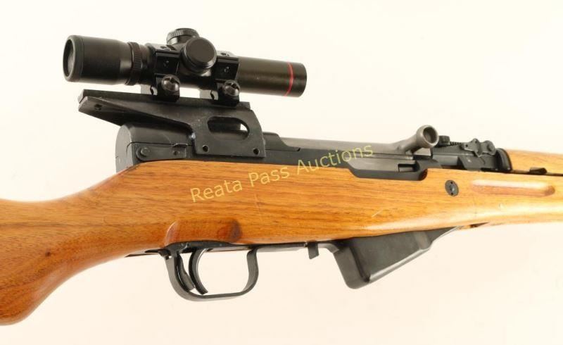 Chinese made gas-operated semi automatic SKS pattern rifle chambered in 7.62x39mm. Imported by DIG, Inc of Virginia Beach, Virginia, circa 1991 with marks on the receiver. Features a blued finish, 20.5" barrel, hooded post front sight, graduated rear sight to 1,000 meters, unmarked 4x 20mm scope on a China marked scope base top cover(welded), manual safety, fixed 10 round magazine, rounded trigger, smooth wood handguard and semi-pistol grip shoulder stock with trapdoor metal buttplate that contains a cleaning kit. All serial numbers are matching. Rifle retains approximately 90% of it's original finish showing light even thinning, few spots of bright wear and light scattered handling marks. Action is crisp, bore is excellent, and wood stocks are near fine. Condition is very good. ***Modern Firearm***