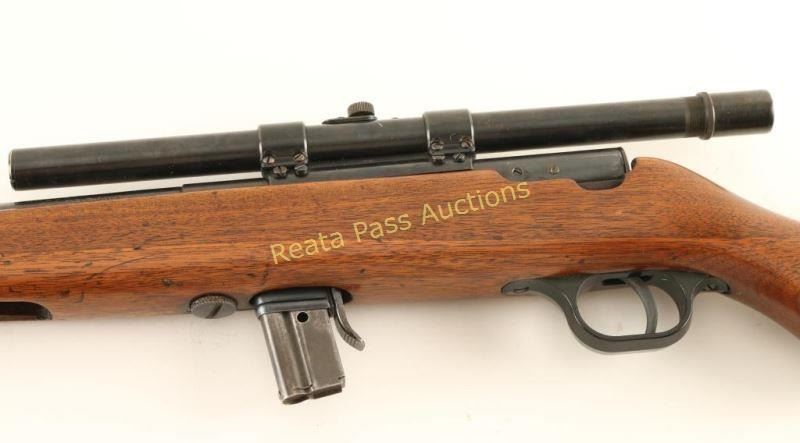 SN: 5924 "Leatherneck" is a blued, semi-automatic, detachable box magazine fed rifle with a 23" barrel, one magazine, Weaver G6 scope, plastic trigger guard and butt plate. Bluing has faded to a brown/plum in some areas and there is small amount of surface rust and freckling. Action does not open, hammer is frozen, cannot check bore. Stock has filled cracks and holes as well as rubs and dings. Condition is poor. *Modern Firearm*