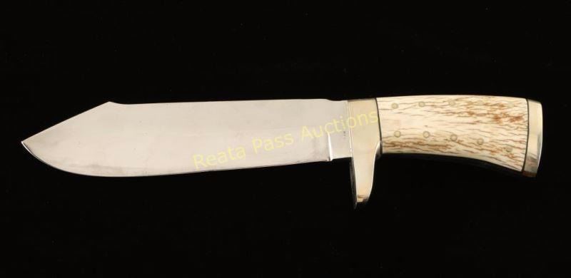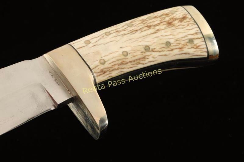 made by James Glamory, marked J.A.MCG, antler handled, named the Dudley Camp Knife, thick high polished blade, includes a letter from the knife maker, measures 12 1/2"overall with a 7" blade, very high quality knife.