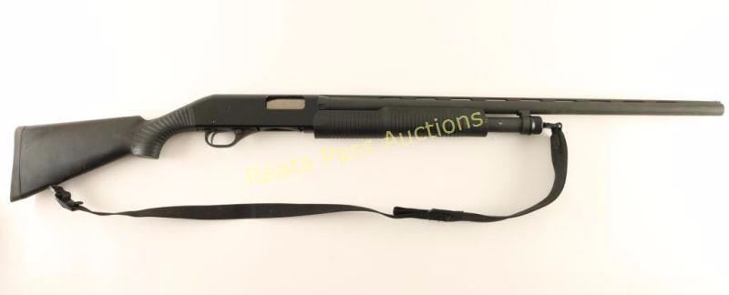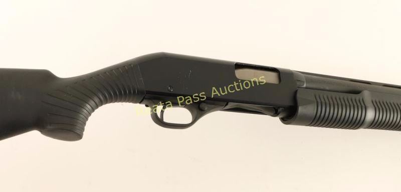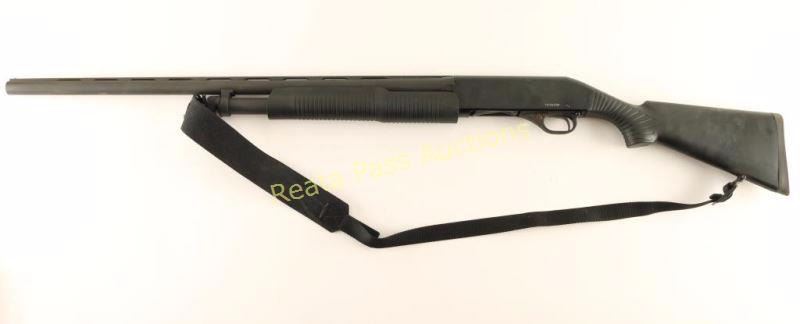 Slide action repeating shotgun chambered for 2 3/4" & 3" 12 gauge shells, produced by Sun City Machinery in China. Imported by Savage Arms of Westfield, M.A. with import marks on the barrel. Features a matte black finish, 28" vent ribbed barrel with removable modified choke, brass bead front sight, 1/2 length tube magazine, push button safety, smooth trigger, Outdoor Connection sling, grooved black synthetic slide handle and pistol grip shoulder stock with soft rubber recoil pad. Includes the original factory cardboard box with plug and lock. Shotgun exhibits approximately 95% of it's original finish showing some light edge wear and scattered handling marks. Action is smooth, bore is excellent and synthetic stocks are very good. Condition is very good++. ***Modern Firearm***