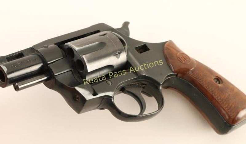 German made snub-nosed double action revolver chambered in .38 Special. Features a blued/black finish, 2" steel barrel with a vent rib shroud, ramp front sight, square notched rear sight, fluted six-shot swing out cylinder, smooth trigger, serrated hammer spur and RG two-piece checkered faux wood plastic grips. Revolver retains approximately 85% of it's original finish showing dark rust & wear on the cylinder and high edge wear on the frame & barrel. It's also missing the cylinder release thumb piece. Action is strong with solid lock-up, bore appear excellent with what looks like dried grease and plastic grips are fine. Condition is good. ***Modern Firearm***