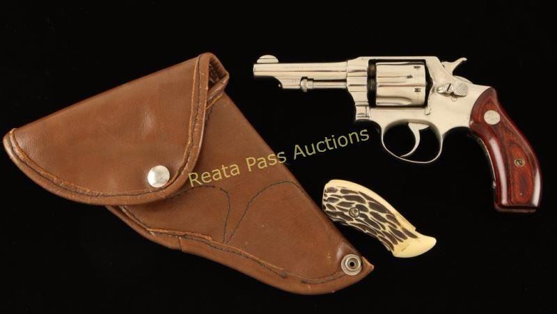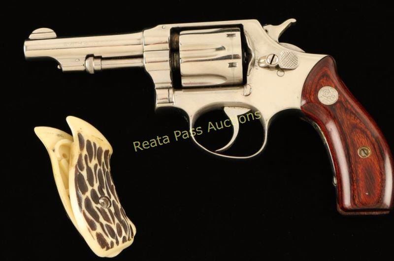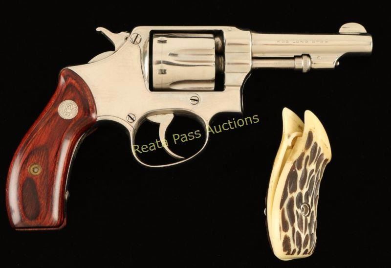 SN: 263567 Vintage small frame double-action revolver chambered in .32 S&W Long, circa 1917-1918. Features a nickel plated refinish, 3.25" barrel with three line address, forged blade front sight, notched rear sight, non-shrouded ejector rod, fluted six-shot cylinder, .240" smooth trigger, .240" hammer with checkered spur and oversized two-piece smooth laminated rosewood grips with S&W medallions. Includes a custom smooth brown leather holster and a pair of faux stag grips. Revolver retains nearly all of it's nickel plated refinish showing many fine handling marks/scratches, a drag line, and old pitting visible under the finish on the frame & trigger. Action performs well with good lock-up, bore is fair with scattered pitting and wood grips are near fine with some minor finish loss. Condition is good as refinished. ***C&R Firearm*** ***Modern Firearm***