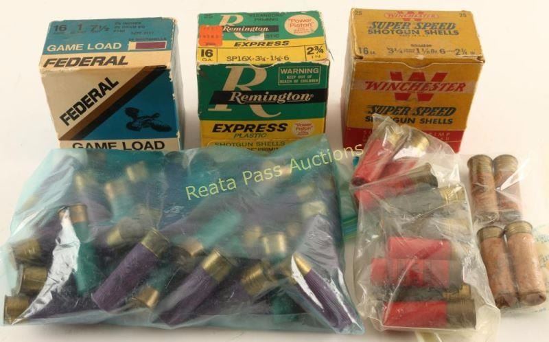 16 Ga, approx 130 Rds including; Winchester Super Speed, Federal Game Load, Remington Express and more. 33 paper and 97 plastic hulls.