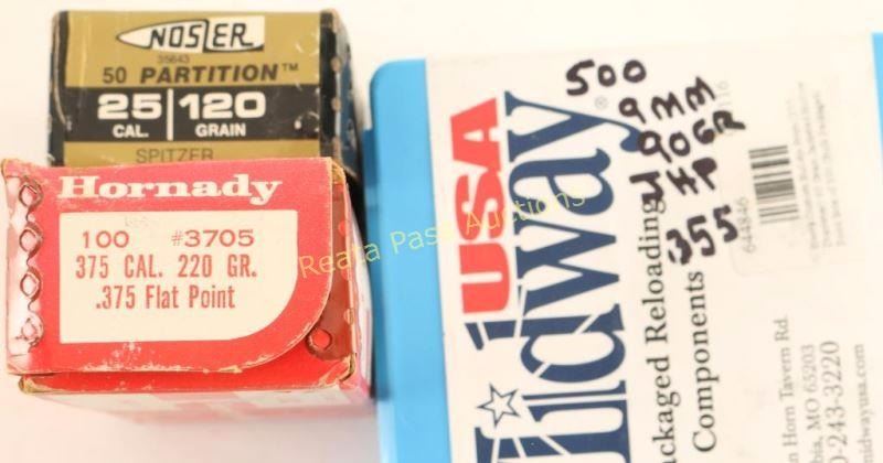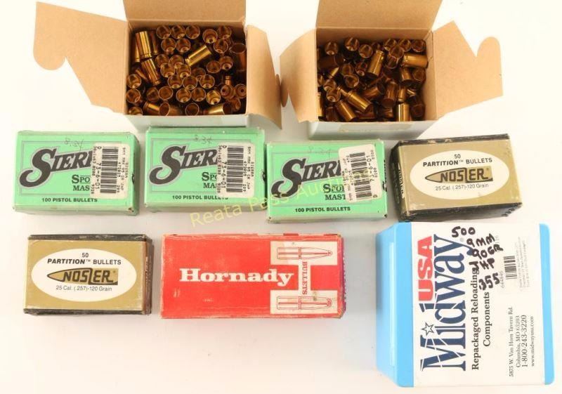 9mm MAK brass and bullets 3 Sierra 1 Midway, 1 and half boxes of .25 cal bullets, .375 cal by Hornady.
