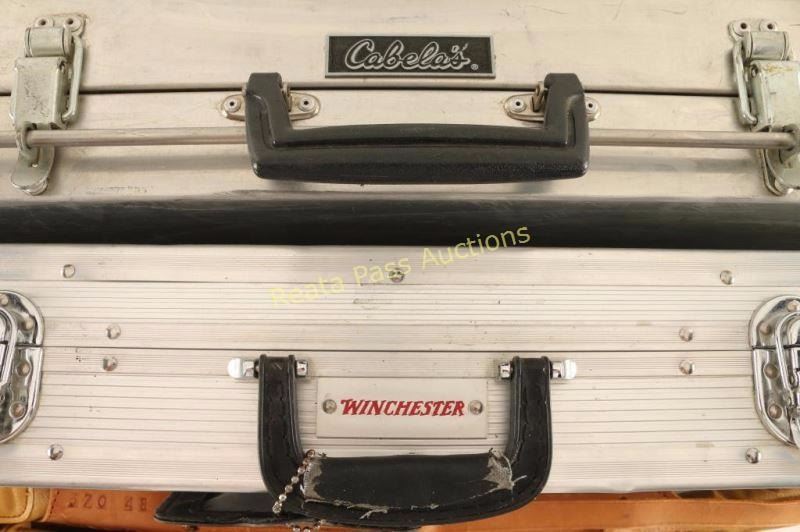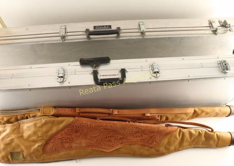 2 leather soft cases partially tooled with floral motif with zippers, 1 Winchester aluminum foam lined case with wheels, and 1 Cabelas aluminum foam lined case. All in good condition.
