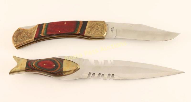 (1) Large Frost Cutlery folding Solingen steel knife with multicolored wood handle and engraved brass ends, measures 14 3/4" overall. (1) multicolored wood handle knife with brass ends and a stainless steel serrated etched blade in a black faux leather sheath.
