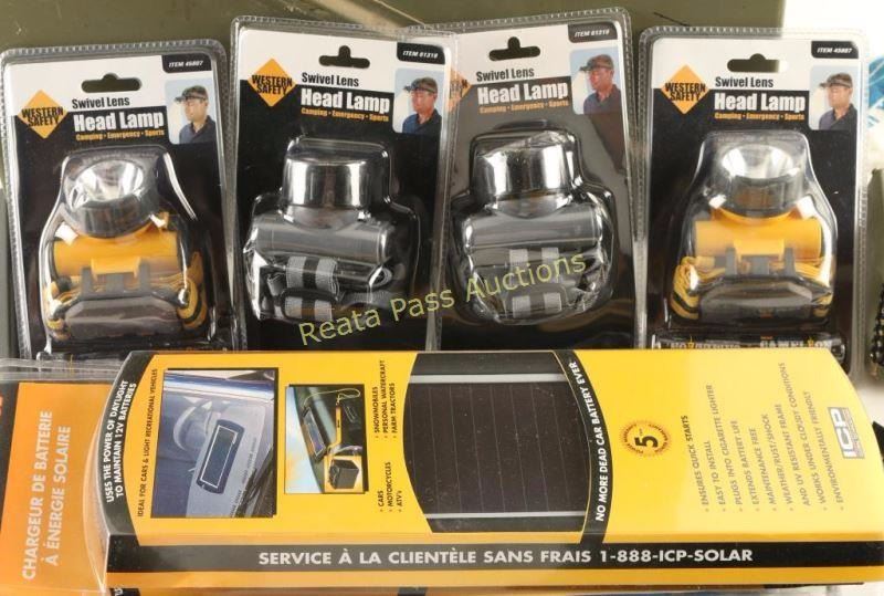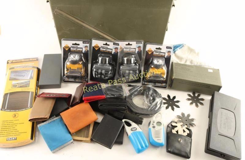 Ammo can with, Solar battery trickle charger, large amount of wallets, ninja throwing starts, 40" dark brown leather belt, (4) Swivel lens head lamps, Treck 2 walkie-talkies, (2) pairs of goggles, precision measuring device and a small caliber cleaning kit.