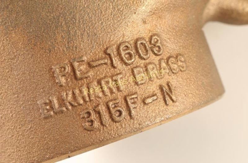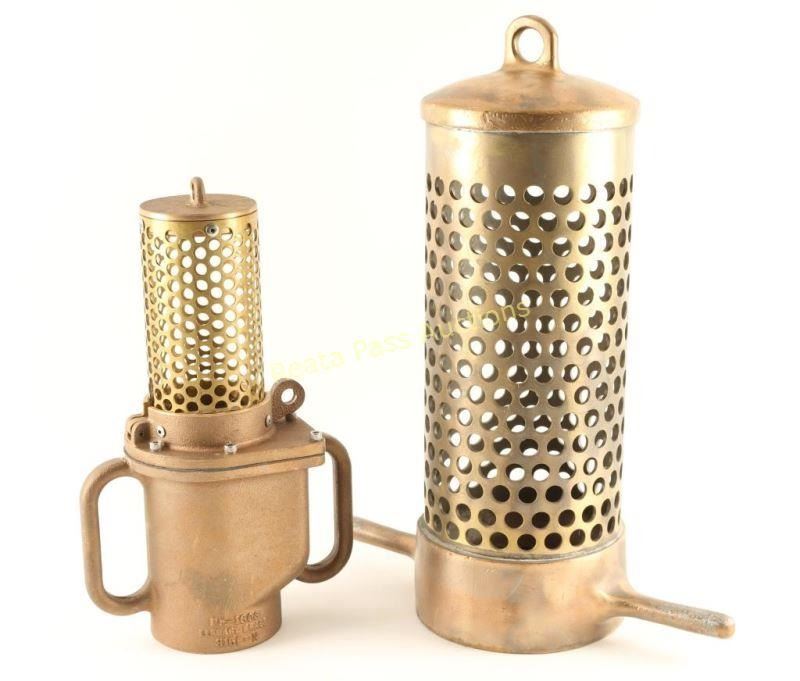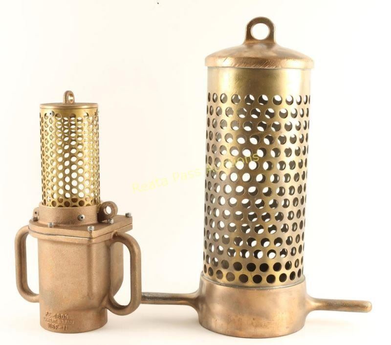 All brass construction for pumping water from a lake or stream. Small strainer has two handles with perforated top, measures 14 1/2"h x 8 1/2"w x 5"d. and reads 'PE-1603 Elkhart Brass, 315F-N'. Larger strainer has two straight handles with a perforated top and measures 18 1/2"h x 14"w x 6 1/2" dia. unmarked. Great display pieces.