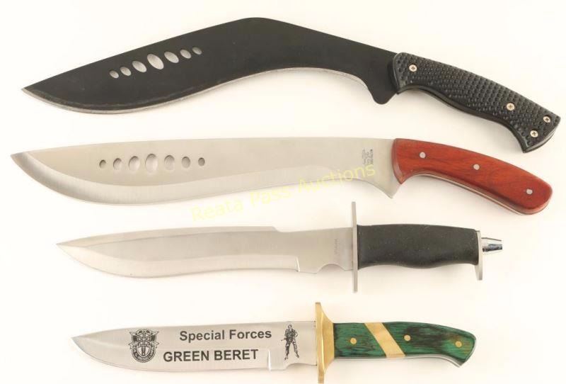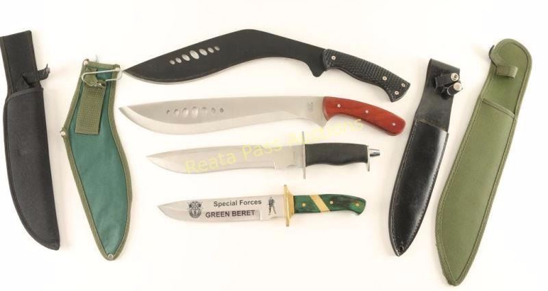 1 large stainless steel bowie knife 9 3/4" blade-14" overall with a black synthetic sheath, 1 Frost Cutlery "Special Forces Green Beret" knife with green wood handle and brass tack and guard in black leather sheath- 8" blade and 13-1/4" overall, 1 Frost Cutlery 'Flying Falcon' 13 1/4" oval vented blade 18 1/2" overall in green webbing sheath, and a curved machete with oval vented blade and plastic handle in green webbing sheath-blade measures 13 1/2" 19 1/4" overall.