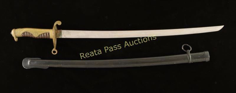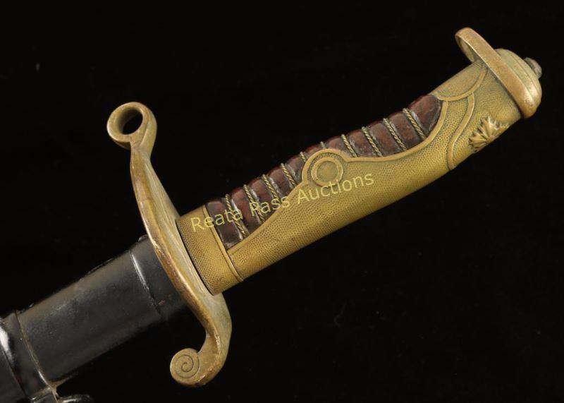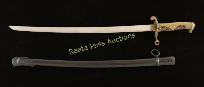 WWII era with wire wrapped leather handle with brass guard and pommel. Measures approx. 25" overall with a 19 1/2" blade. Comes in black metal sheath.