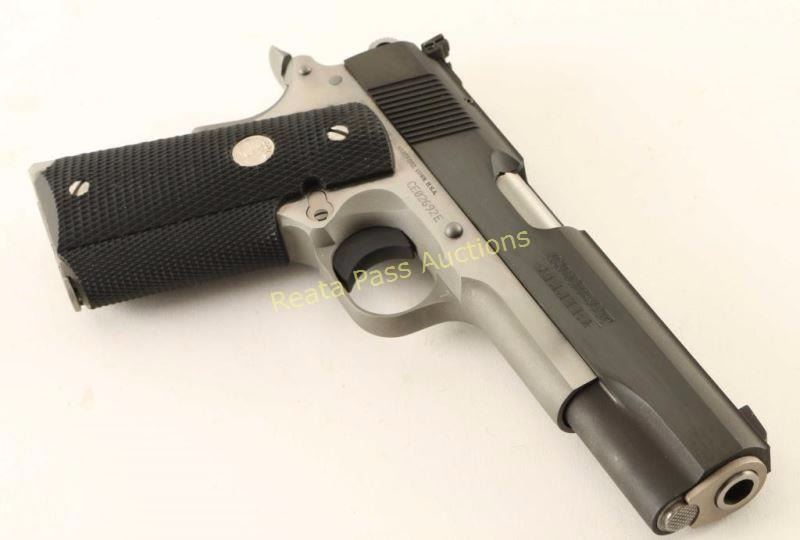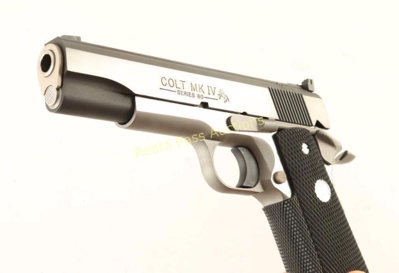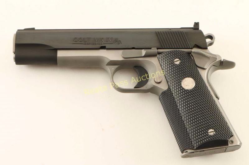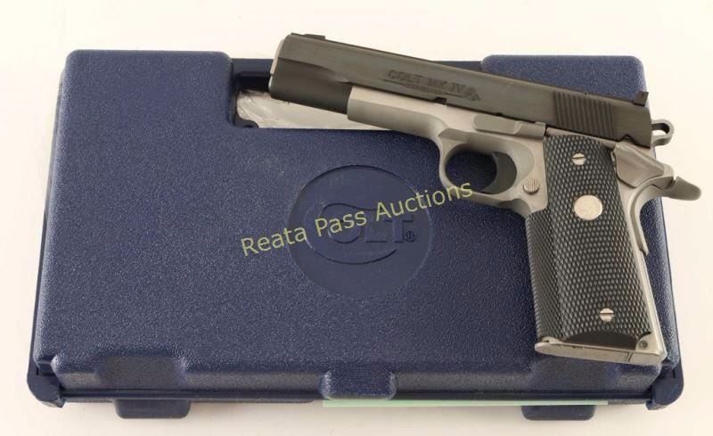 'MK IV Series 80' 1911-A1 style single-action semi-automatic pistol chambered in .38 Super. Features a dual-tone finish, 5" barrel, blued slide, patridge front sight, adjustable rear window sight with white outline, brushed/matte finished stainless steel frame, smooth trigger, skeletonized hammer, thumb safety, beavertail grip safety, push button magazine release, 9 round factory magazine, and one-piece checkered black rubber wrap-around grips with Colt medallions. Includes a factory hard case, sleeve, documents, and extra magazine. Pistol shows very little wear with only a couple minor handling handling marks observed. Action is crisp, bore is pristine, and grips are fine.