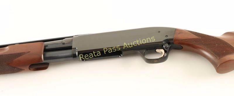 High quality Japanese made slide action repeating shotgun chambered for 2 3/4" & 3" .410 gauge shells, circa 2003. Features a blued finish, 26" barrel with raised vent rib & full Invector choke, wide smooth gold trigger, sliding safety, checkered walnut slide handle and pistol grip shoulder stock with factory black hard rubber buttplate. Includes the original factory cardboard box with lock and modified & improved cylinder chokes. Shotgun retains some of original packing grease and exhibits little to no visible wear. Action is smooth, bore is pristine and wood stocks are near fine with some worn points.