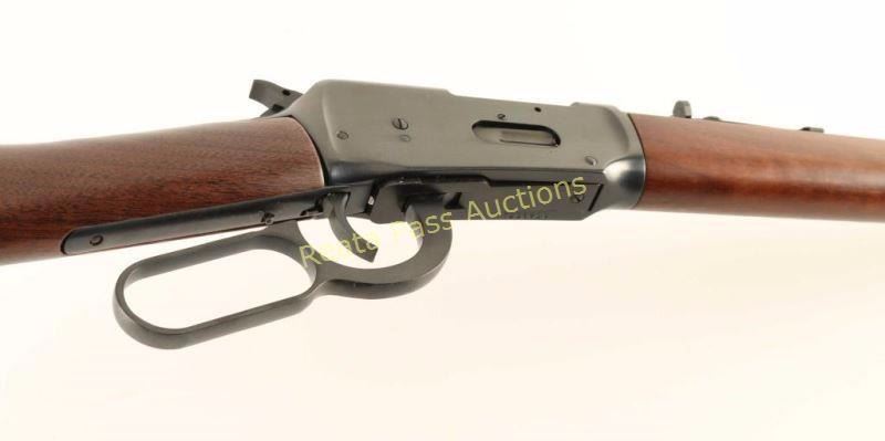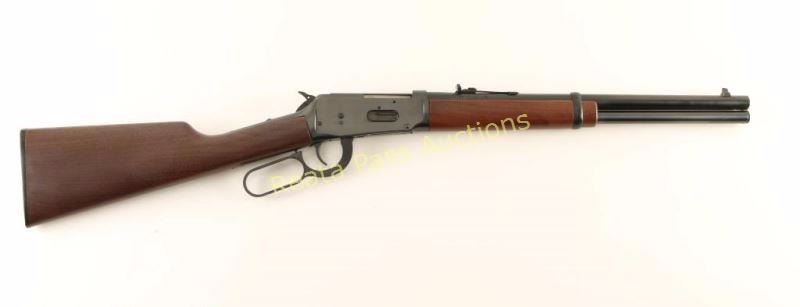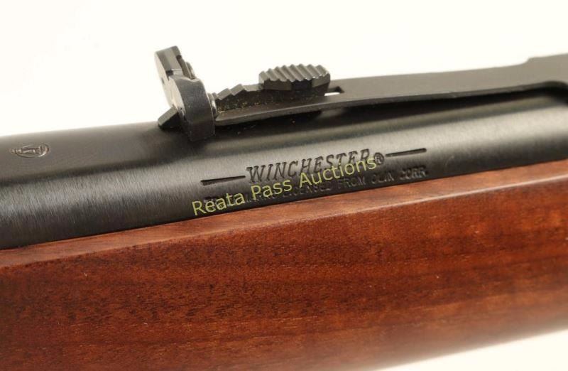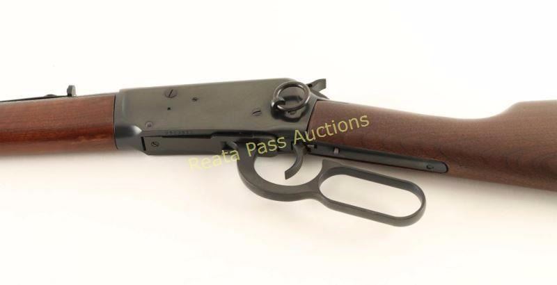 'Angle Eject - SRC' Desirable lever action repeating rifle chambered in .357 Magnum. Features a blued finish, 16" tapered barrel, full-length tube magazine, dovetailed blade front sight, adjustable rear sporting sight, drilled & tapped receiver, serrated hammer spur, grip safety, beveled trigger, saddle ring, sliding tang safety, smooth walnut forend and straight grip shoulder stock with factory hard rubber buttplate. Includes factory documents. Rifle exhibits approximately 99% of it's original blued finish showing only minor handling marks. Action is smooth, bore is pristine and wood stocks are fine.