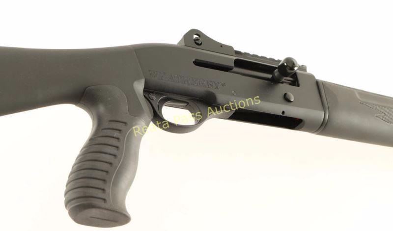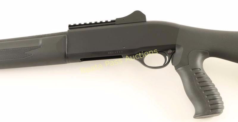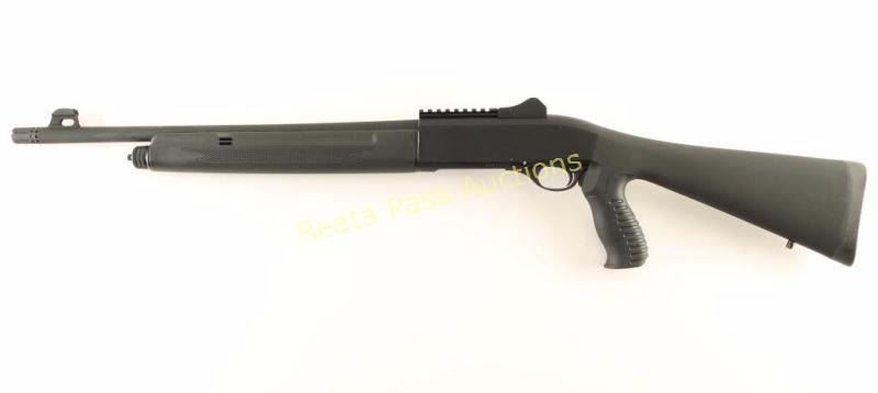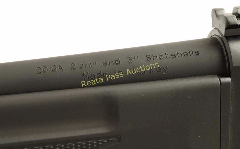 Turkish made tube-fed semi-automatic shotgun chambered for 2 3/4" & 3" 20 gauge shells. Features a matte black finish, 18.5" barrel with removable extended skeet choke, raised & winged fiber optic front sight, adjustable shrouded ghost ring rear sight, 3/4 length magazine tube, scope rail, smooth trigger, push button safety, swivel studs, checkered black synthetic forend and smooth shoulder stock with rubber recoil pad & ergonomic pistol grip. Includes the original factory cardboard box with manual, lock, choke tool & 'Heavy Loads' valve. Shotgun exhibits little to no visible wear. Action is smooth, bore is pristine and synthetic stocks are fine.