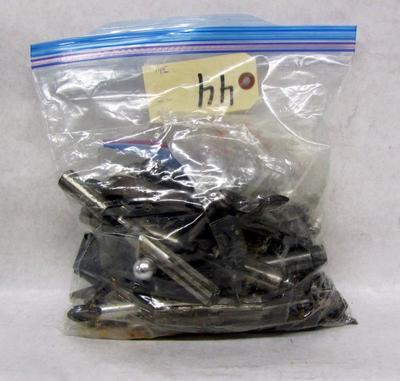 BAG OF ASSORTED PARTS FOR VARIOUS FIRARMS. INCLUDES BOLTS, BOTTOM METAL, SPRINGS, TRIGGER GUARDS, AND MORE. SOME PARTS HAVE RUST.