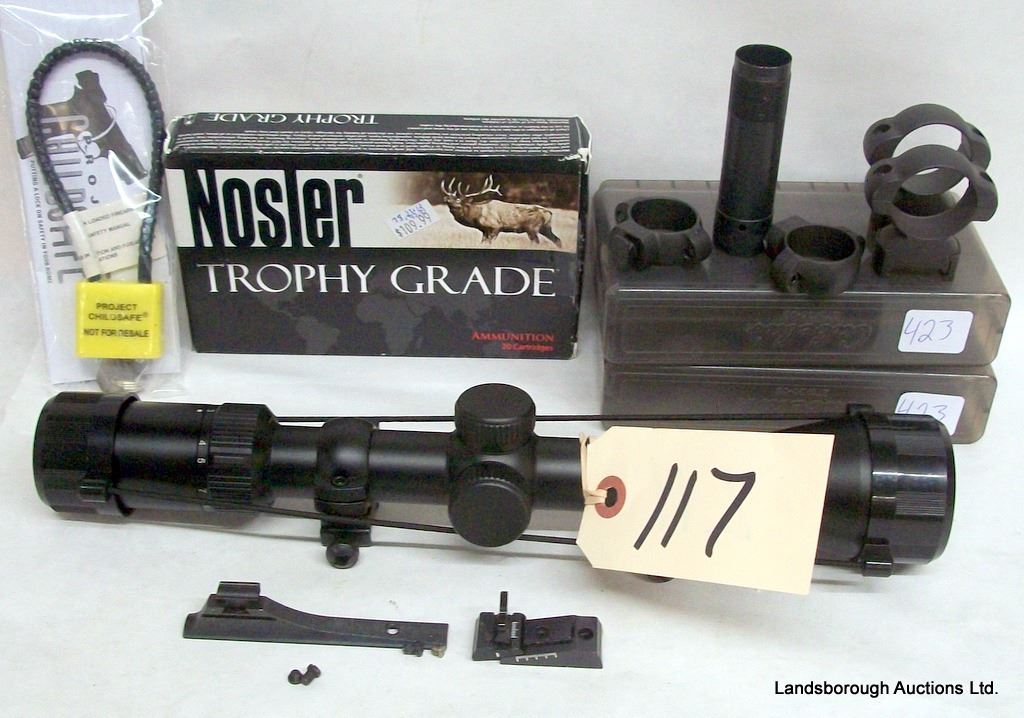 4 RNDS NOSLER TROPHY GRADE 375 H&H MAGNUM, TWO AMMO BOXES FOR 270 OR 30-06, BROWNING 12GA XF TURKEY CHOKE, CABLE LOCK, RINGS, RIFLE SIGHTS, WEAVER 3-9 X 40 SCOPE.