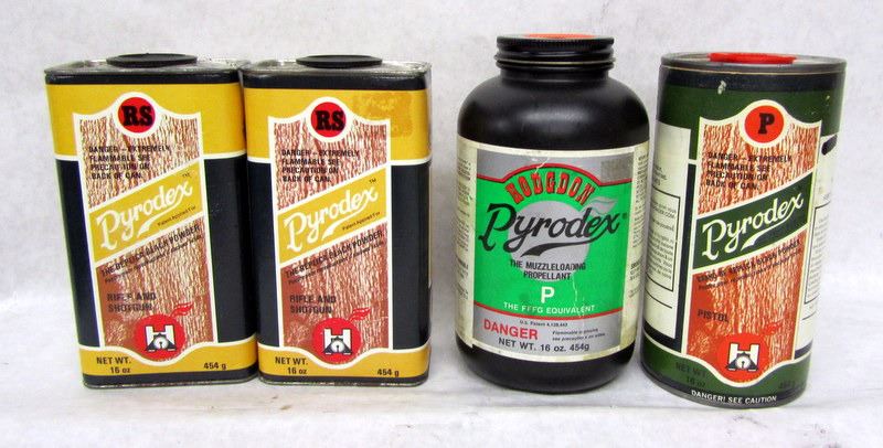 PICK UP ONLY, WILL NOT SHIP. TWO CANS OF PYRODEX RS POWDER, FULL OR MOSTLY FULL. TWO CANS OF PYRODEX P POWDER, ONE NEARLY FULL, ONE ROUGHLY 30% FULL.