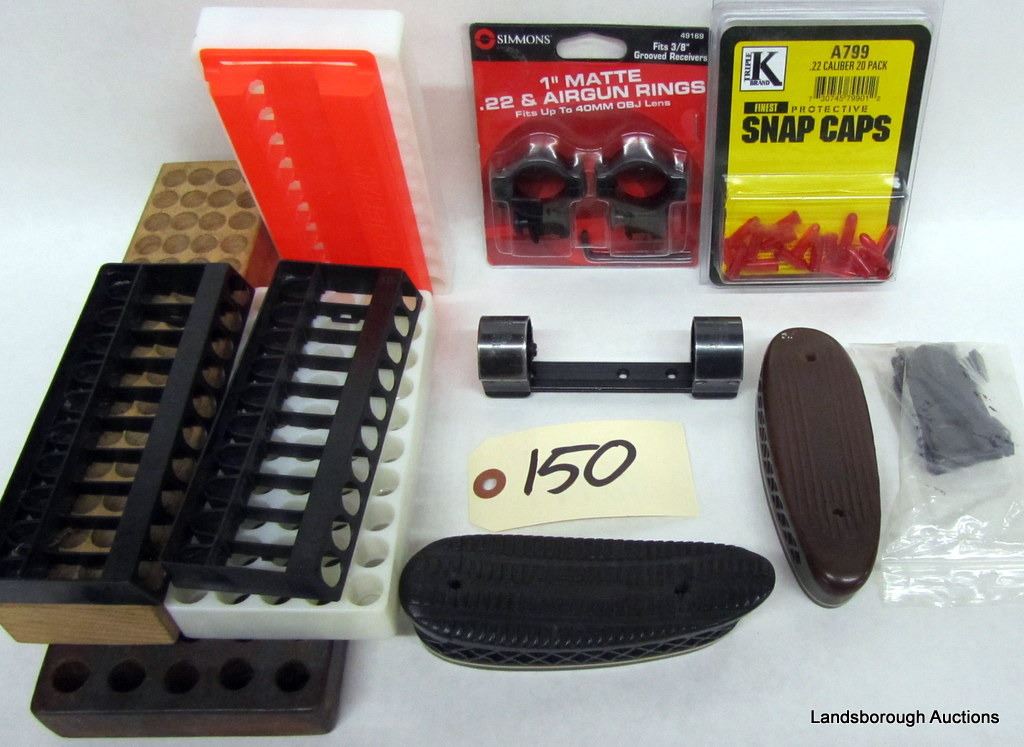 WO WOODEN AND 5 PLASTIC BULLET HOLDERS, ONE 20PK .22CAL SNAP CAPS, 2 PACHMAYR BUTT STOCKS, ONE 1" WEAVER PIVOT MOUNT, ONE TWO PK 1" .22/AIRGUN RINGS, AND ONE OLD MARLIN MAG PLUS SIGHTS