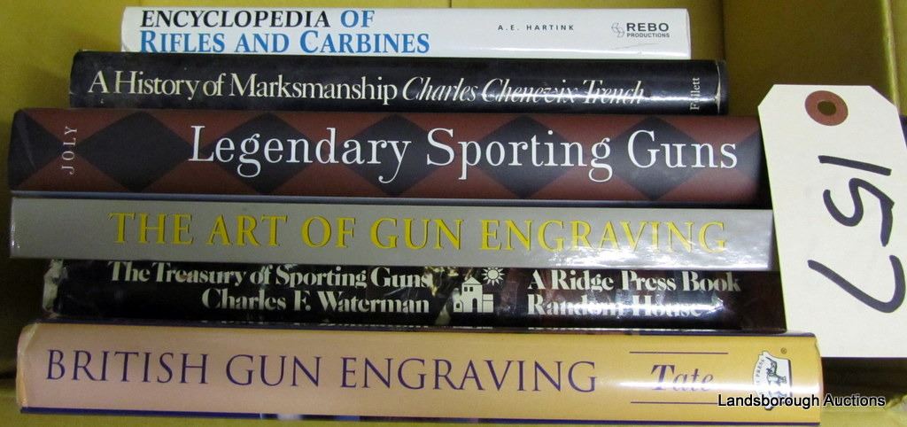 6 HARD COVER BOOKS- A HISTORY OF MARKSMANSHIP, ENCYCLOPEDIA OF RIFLES AND CARBINES, BRITISH GUN ENGRAVING, THE TREASURY OF SPORTING GUNS, THE ART OF ENGRAVING, AND LEGENDARY SPORTING GUNS