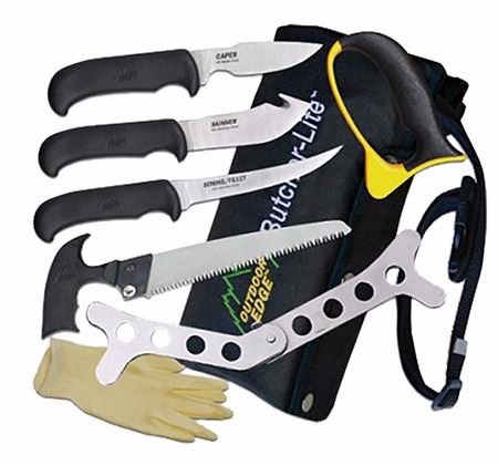 Outdoor Edge BL1 Butcher Lite Knife Set 3" Caping/4.25" Gut Hook/6" Boning & Saw 420 Stainless 8 Piece Set Synthetic Rubber Black