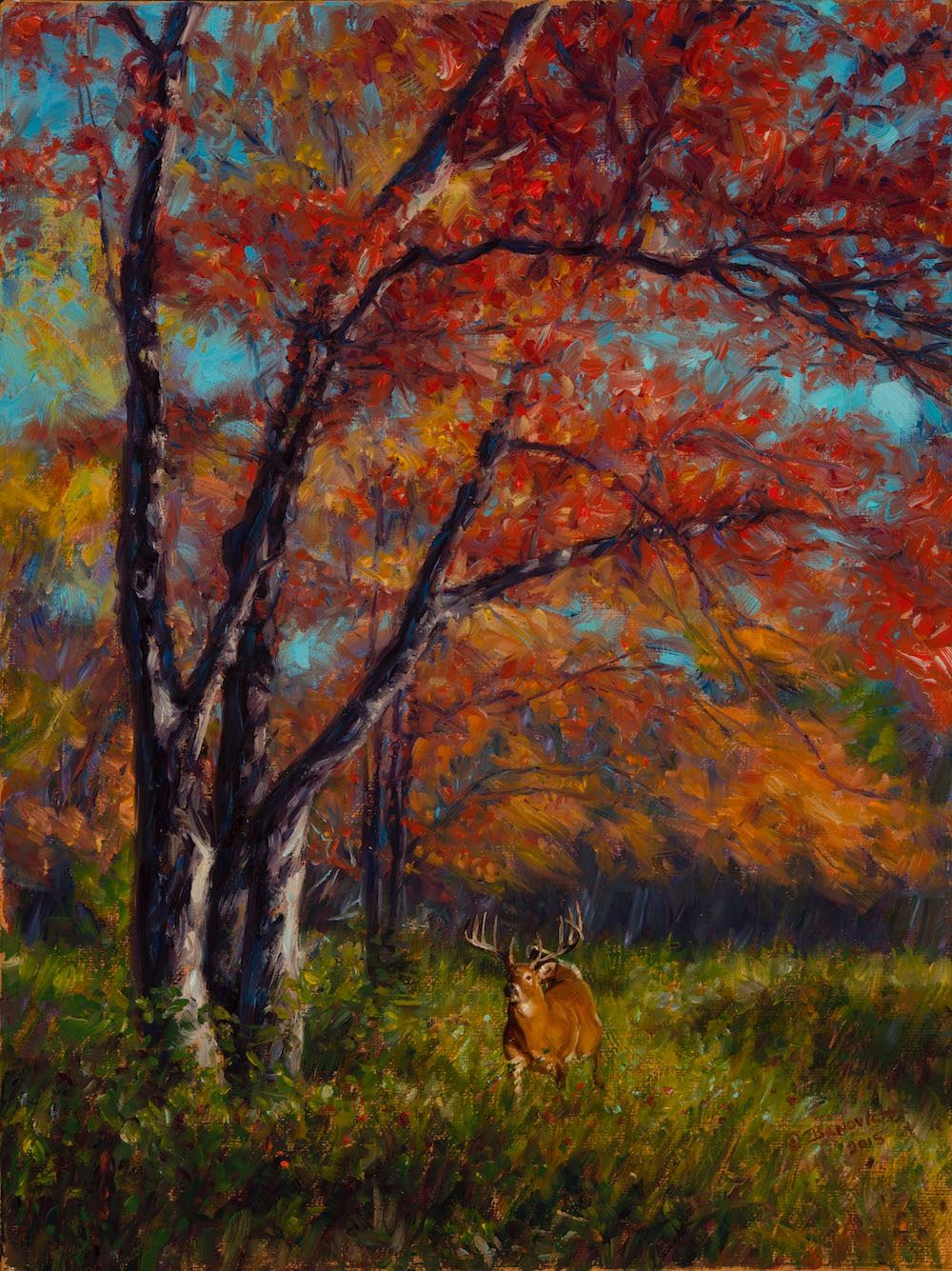 This is a 2016 Limited edition giclée canvas 11h x 8w inches, Edition 5/175.?"What inspires me so much about the New England fall is the crisp cool mornings, the short days anddramatic light, and the kaleidoscope of bright colored leaves painting the hills, red, yellow, orange and crimson. Seeing it each year is like seeing it for the first time. It inspires me to paint it over and over again. Many times as I have sat amongst the spectacular maples and other hardwoods, suddenly a whitetail deer appears out of nowhere. Like ghosts of the forest the seem to disappear as magically as they arrived.” - John Banovich http://johnbanovich.com/