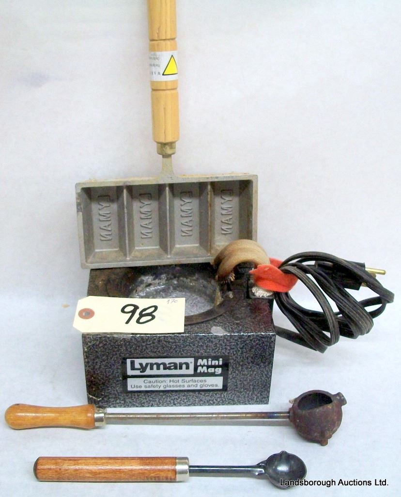 LYMAN MINI MAG MELTER, LYMAN INGOT MOULD, 2 LADLES.