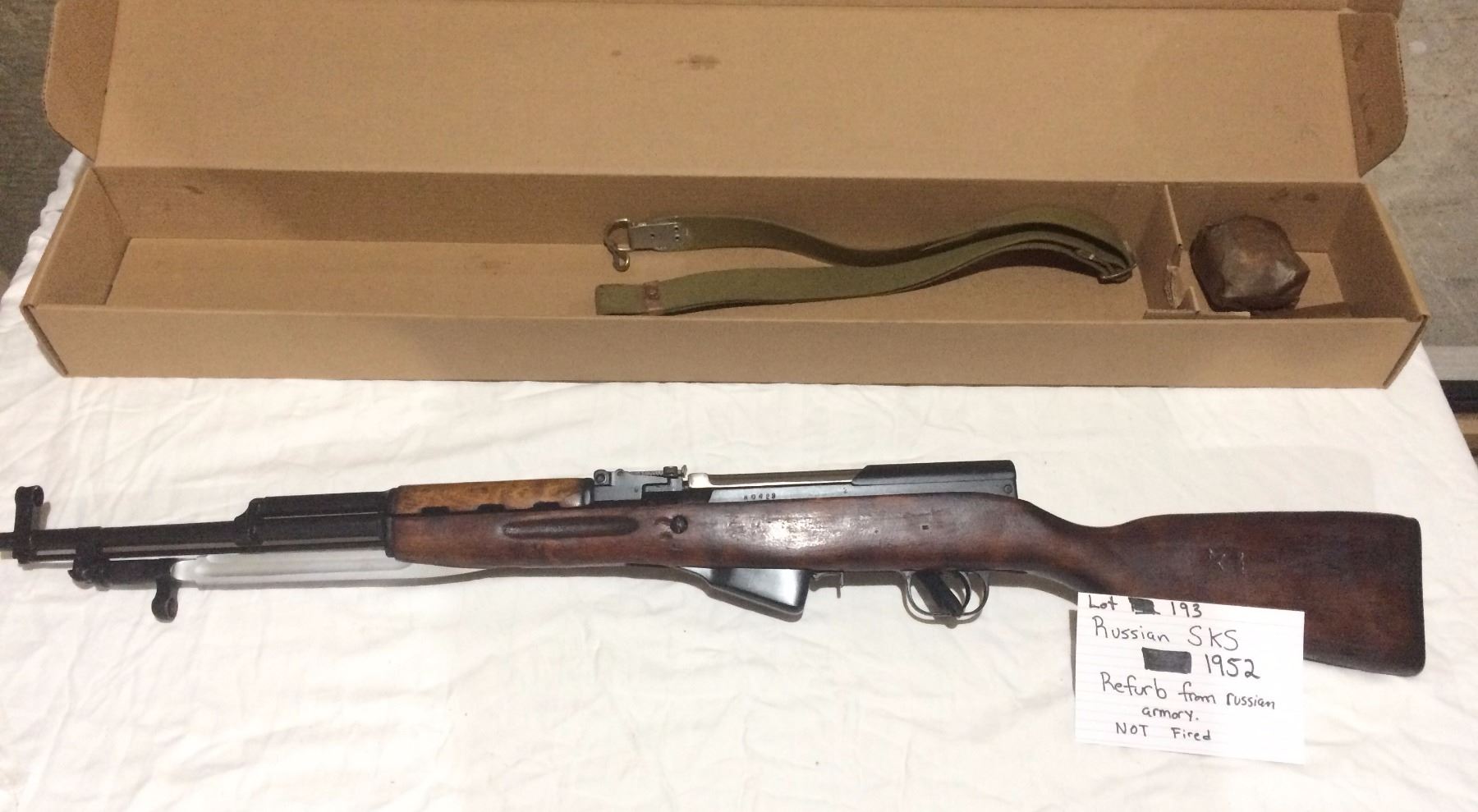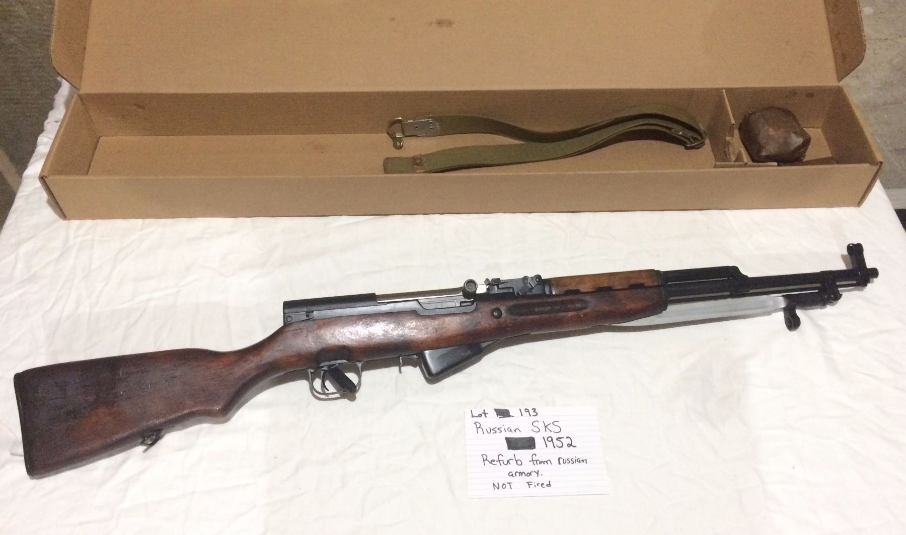 RUSSIAN SKS, MODEL 1952, 7.62X39, SEMI AUTO, CONDITION VERY GOOD, NEVER FIRED, W/BAYONET, STRAP, BOX