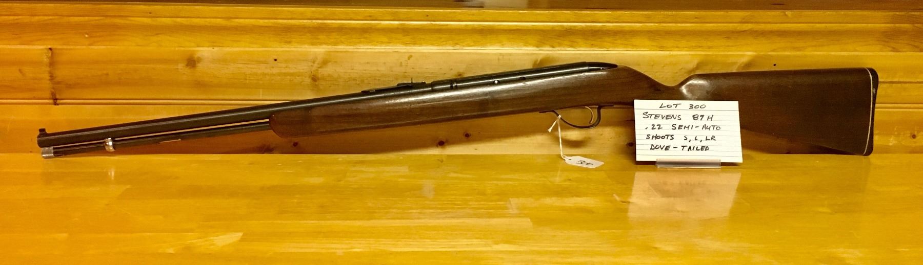 STEVENS, MODEL 87H, .22, S/N NONE, SEMI AUTO, WOOD VERY GOOD, BLUING VERY GOOD, BORE GOOD, W/ IRON SIGHTS, NOTE/ DOVETAIL GROVE, SHOOTS S, L, LR & HIGH SPEED SHORTS