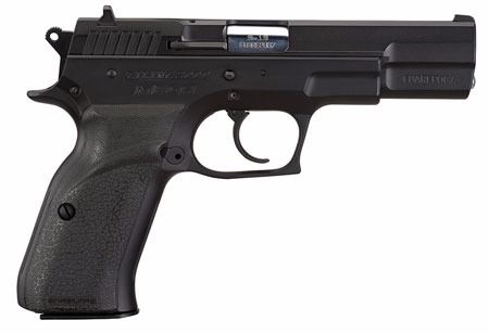 Sarsilmaz's Mega Pistol features a steel alloy frame and slide with a black