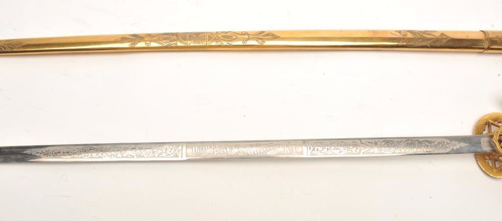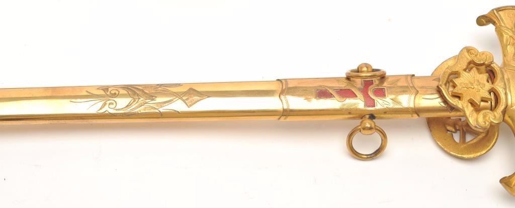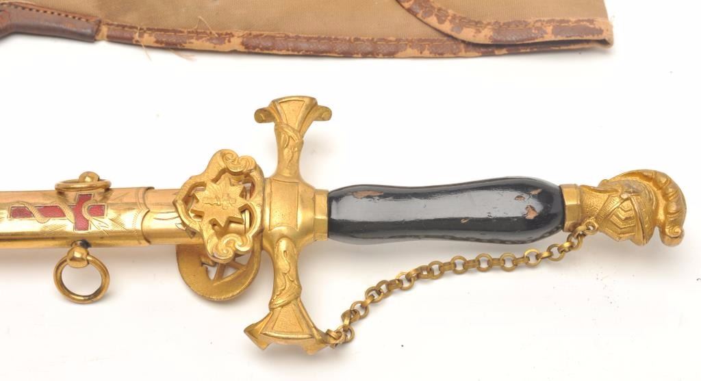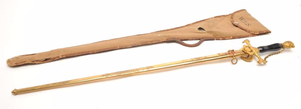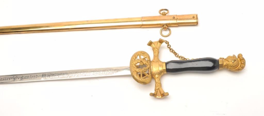 Ceremonial Lodge style sword. The sword is in good overall condition with a 24” blade engraved, “Walter F. Sanford” and an overall length of 29 ½”. The opposite side of the sword is engraved, “Hugh DePayens CommanderyK.T.”. The blade is maker marked, “Ames Sword Co. Chicopee”. The gold tone hand guard depicts a cross with a smooth wood handle and knight’s helmet at the pommel. The gold tone metal scabbard is lightly etchedwith a red cross and hangers. The lot includes a canvas sheath marked, “W.F.S.” Est.: $50-100